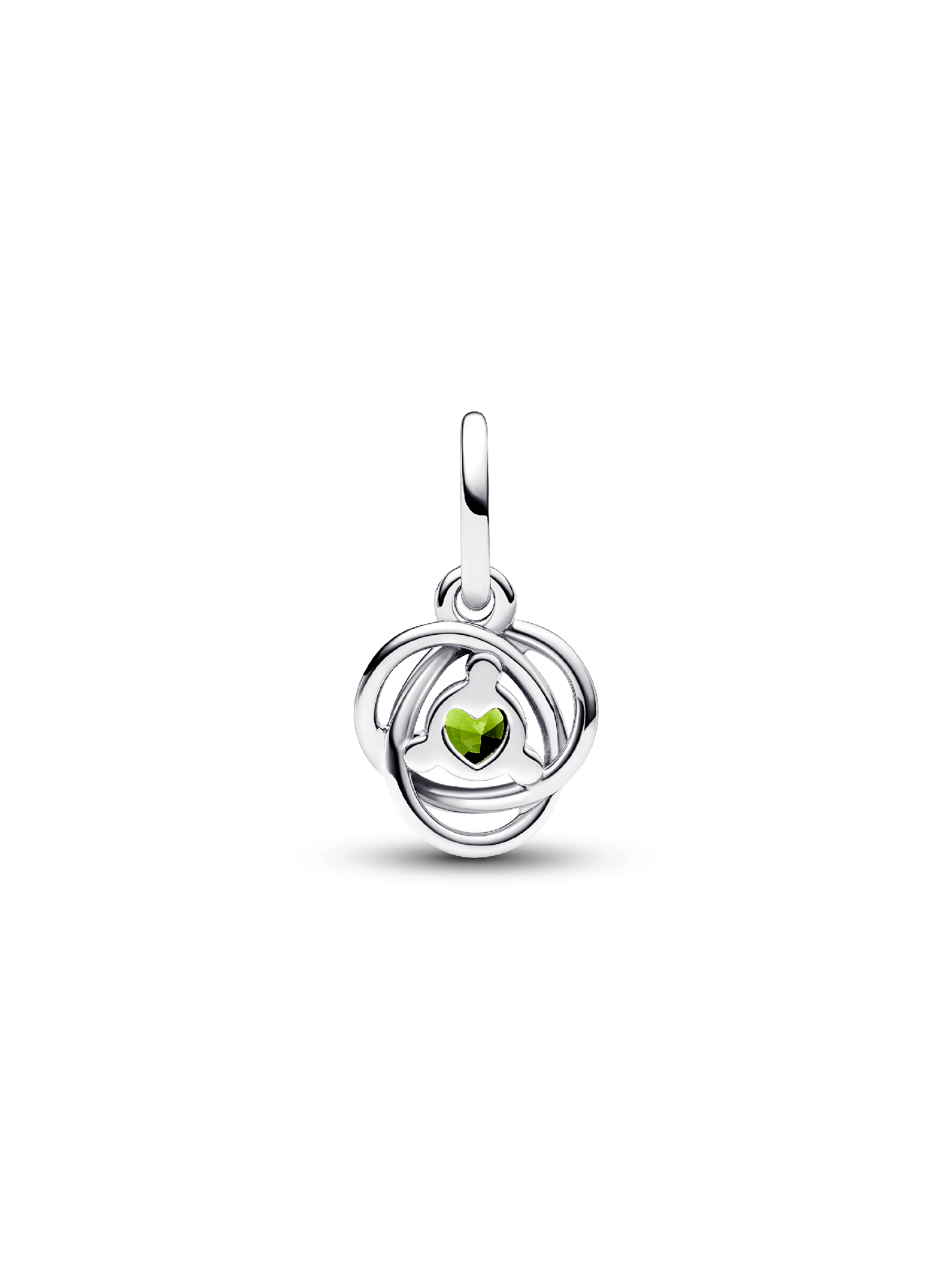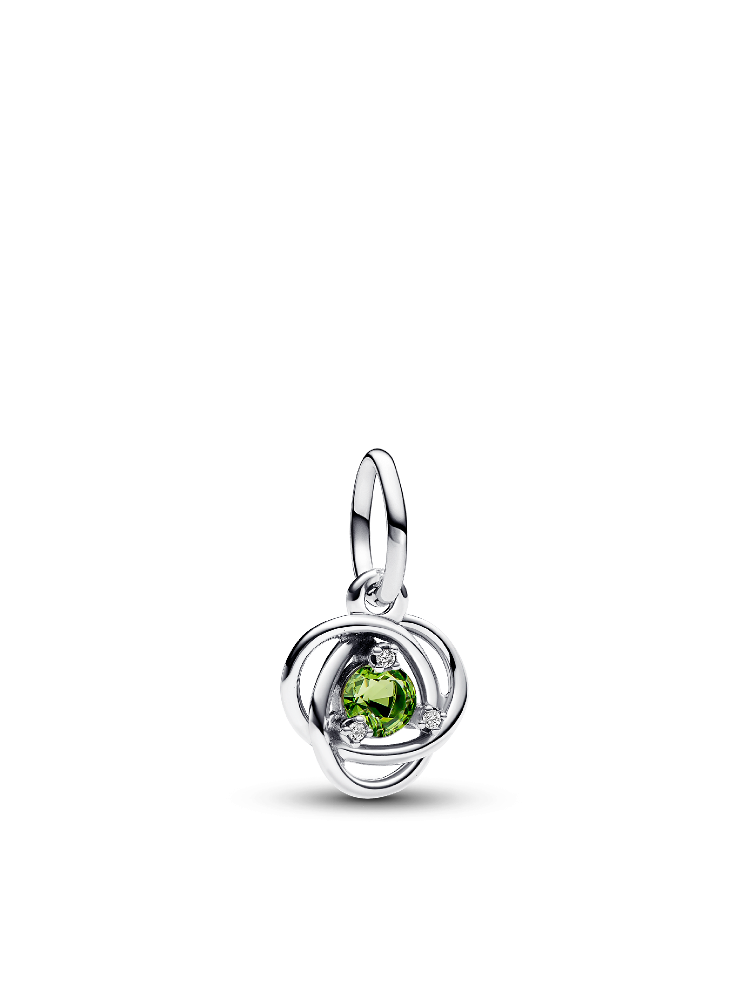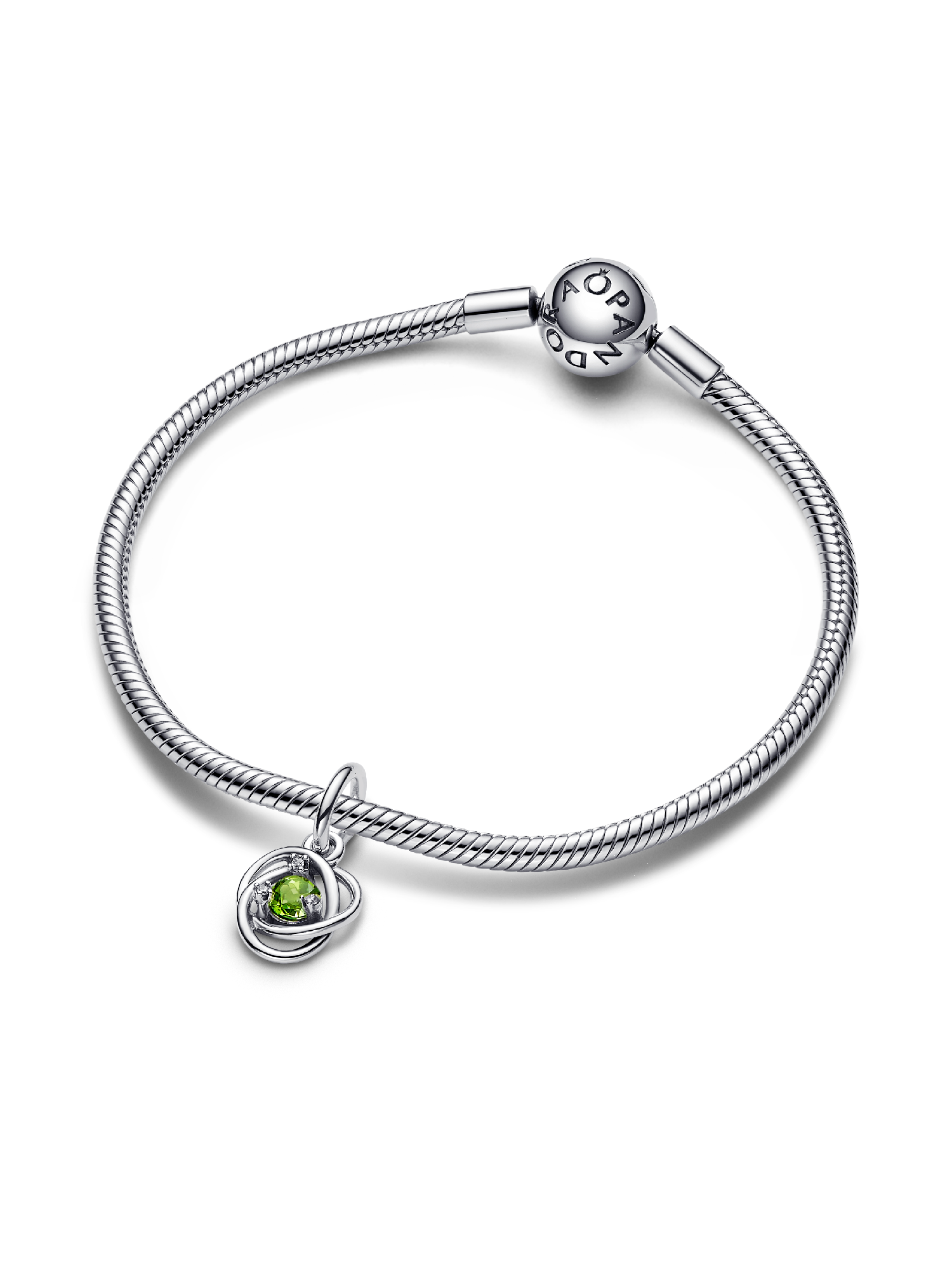 This intricate Spring Green Eternity Circle Dangle Charm is a must-have infinity charm for your Pandora Moments collection. Crafted in lustrous sterling silver, it features an openwork infinity braid decorated with a central spring green man-made crystal, elegantly surrounded by three clear cubic zirconia. The detailed design symbolizes eternity and adds an additional layer of meaning to the piece. Elevate your bracelet with this essential piece or gift it as a representation of an everlasting bond.