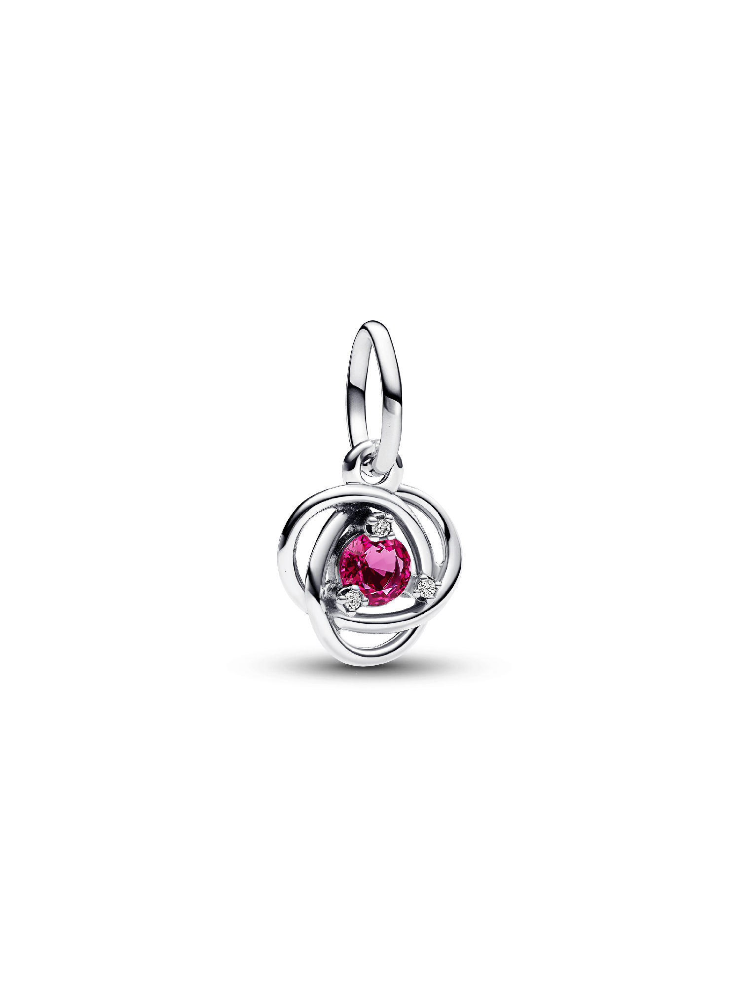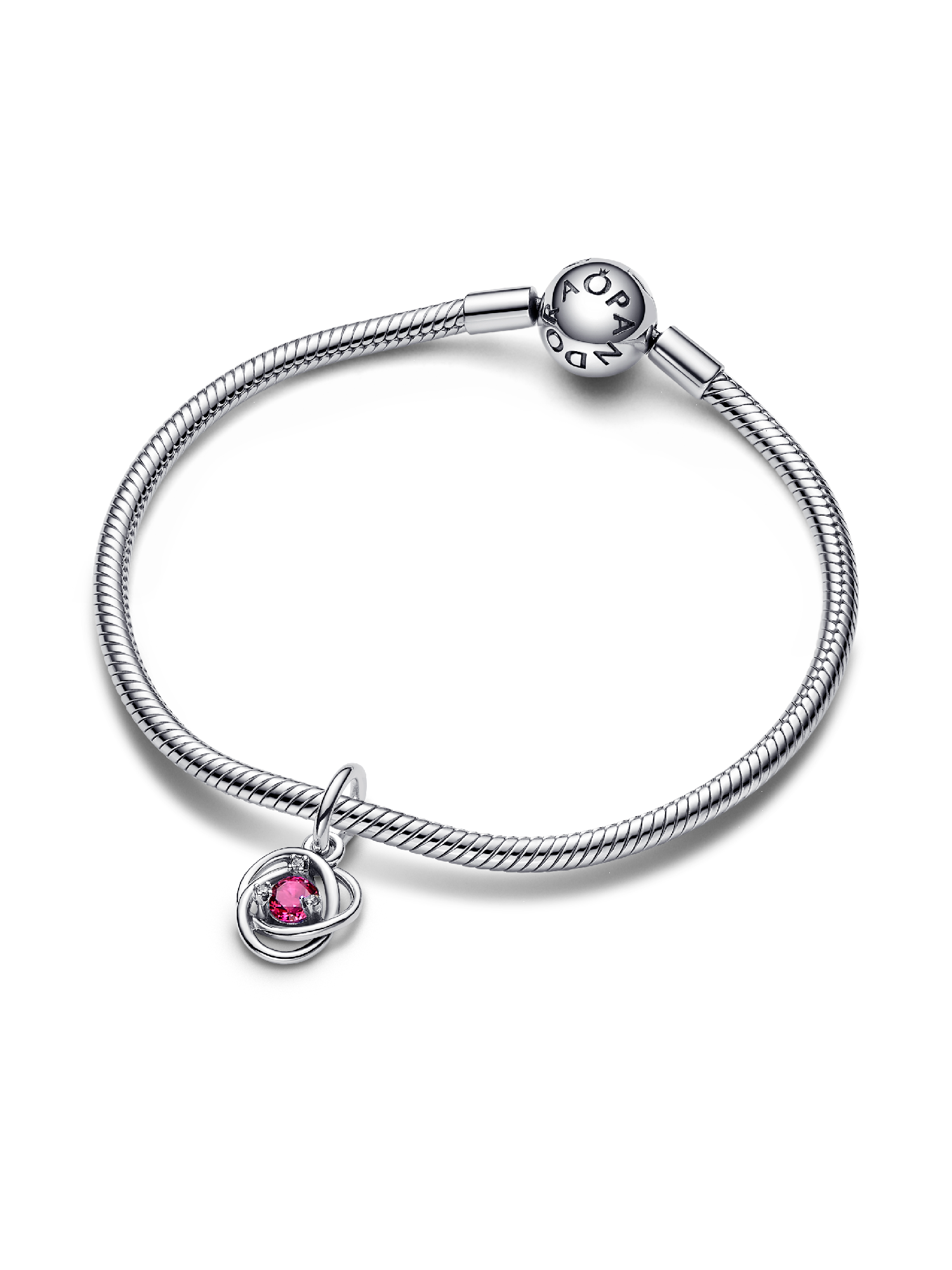 This intricate Pink Eternity Circle Dangle Charm is a must-have for any collection. Crafted in lustrous sterling silver, it features an openwork infinity braid decorated with a central pink man-made crystal, elegantly surrounded by three clear cubic zirconia. The intricate design symbolizes eternity and adds an additional layer of meaning to the piece. Elevate your bracelet with this essential piece or gift it as a representation of an everlasting bond.