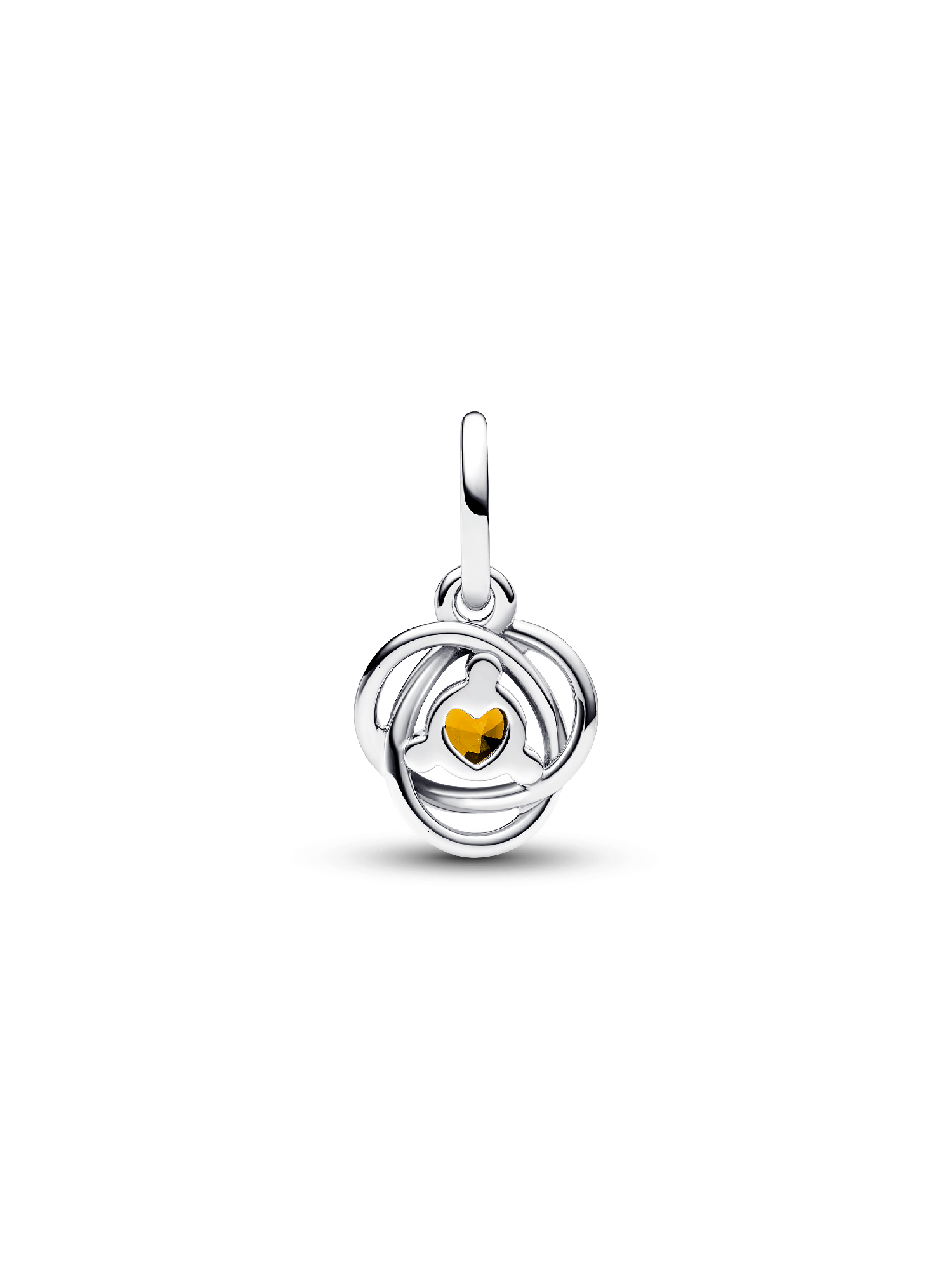 This intricate Honey Eternity Circle Dangle Charm is a must-have infinity charm for your Pandora Moments collection. Crafted in lustrous sterling silver, it features an openwork infinity braid decorated with a central honey-colored man-made crystal, elegantly surrounded by three clear cubic zirconia. The intricate design symbolizes eternity and adds an additional layer of meaning to the piece. Elevate your bracelet with this essential piece or gift it as a representation of an everlasting bond.