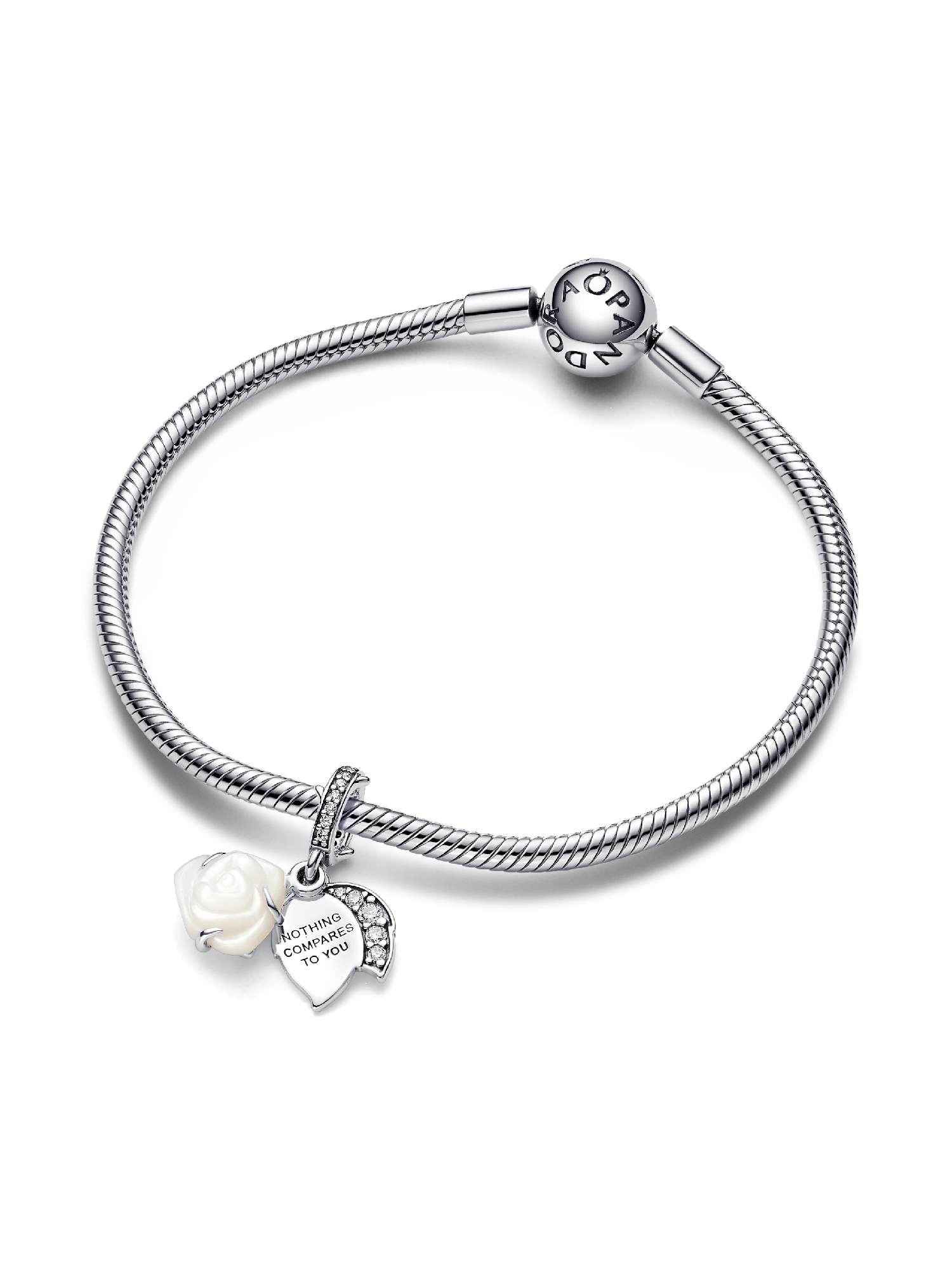 Embrace elegance with the White Rose in Bloom Double Dangle Charm, a sterling silver piece filled with love and symbolism. The intricately designed charm features a white bioresin man-made mother of pearl rose, its layered petals capturing the essence of a blooming flower. Adorned with clear cubic zirconia, this charm is a sparkling tribute to love. The engraved message "NOTHING COMPARES TO YOU" adds a personal touch. The thoughtful details, from the thorn-adorned bail to leaf-shaped discs, make this giftable Pandora Moments charm an enduring symbol of pure love.