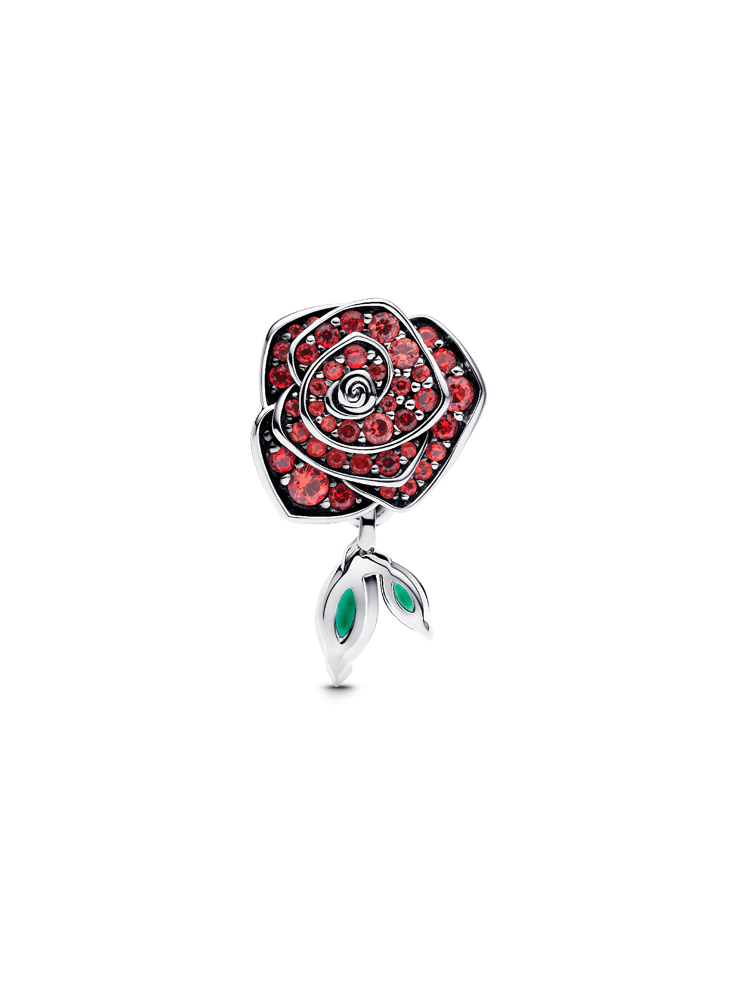 Embody floral elegance of our Sparkling Rose in Bloom Charm, a symbolic piece crafted in sterling silver. Intricately designed to capture the delicate nature of the flower, the charm features a layered petal effect to reflect the beauty of a rose in bloom and is covered with red man-made crystals. To lend an air of life-like details and movement, two green stones dangle beneath the flower representing leaves. Perfect as a gesture of love for someone close or as a meaningful addition to your collection, this Pandora rose charm is sure to keep the romance alive.
