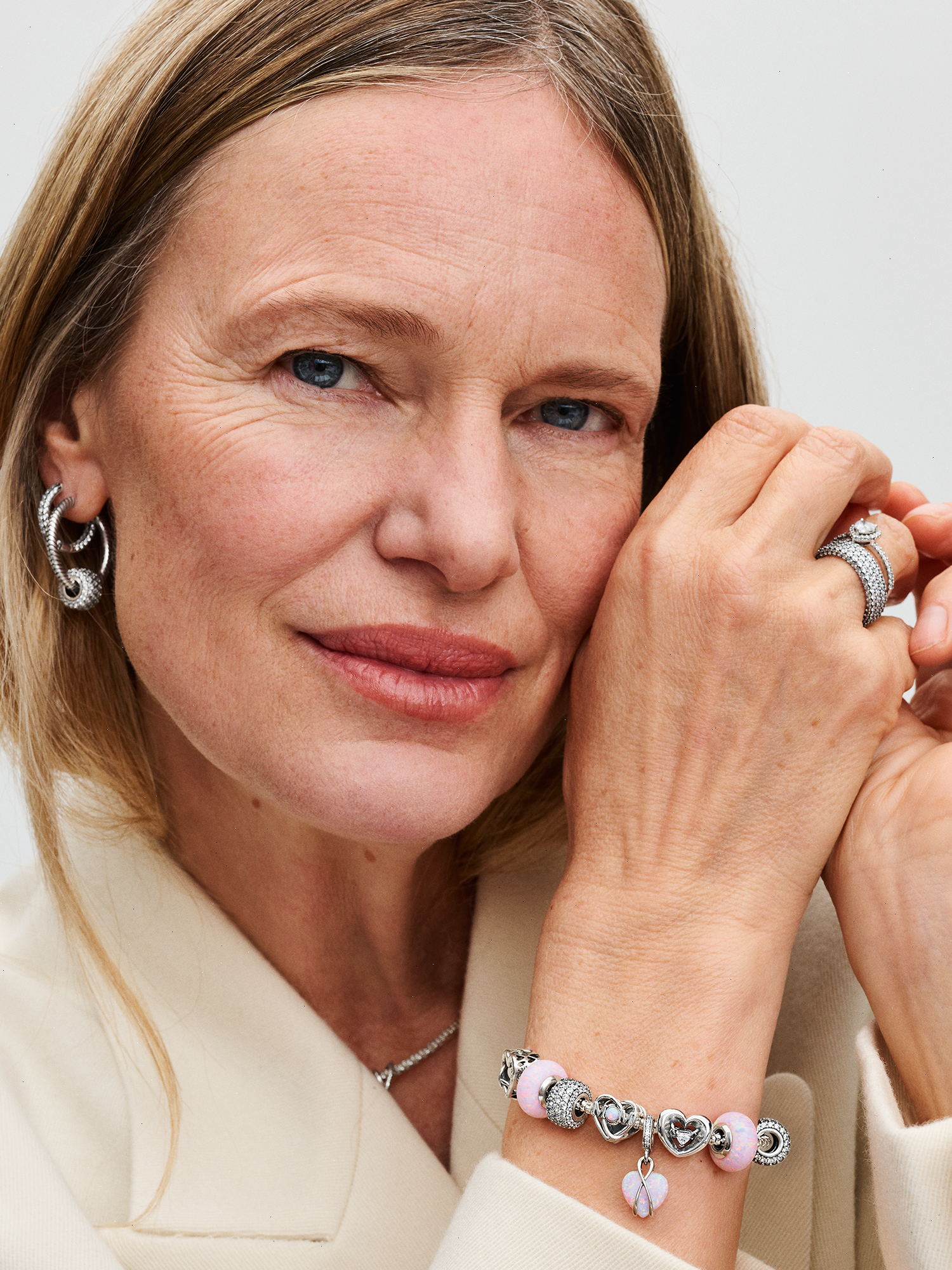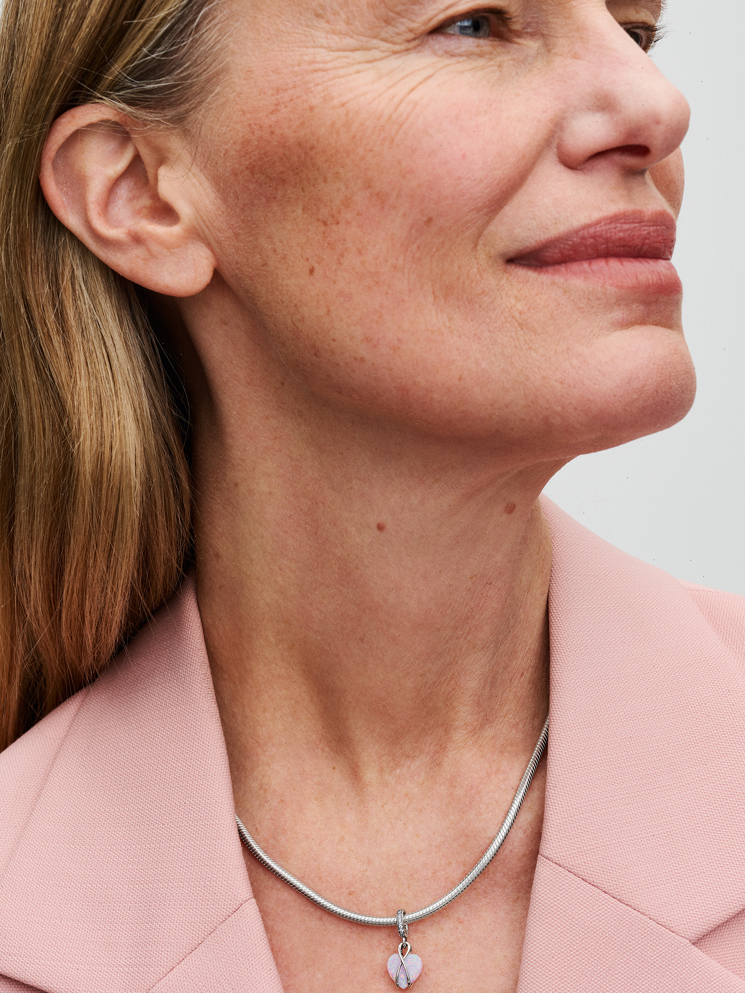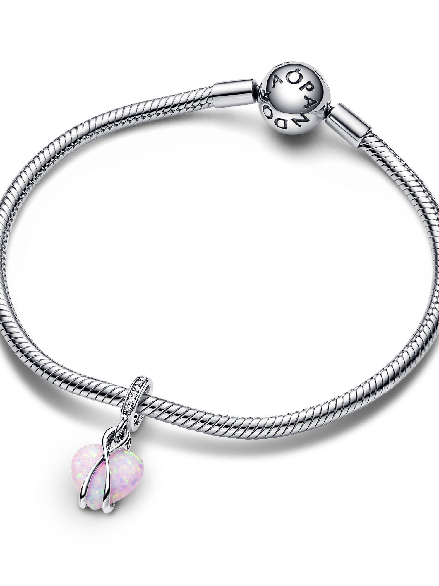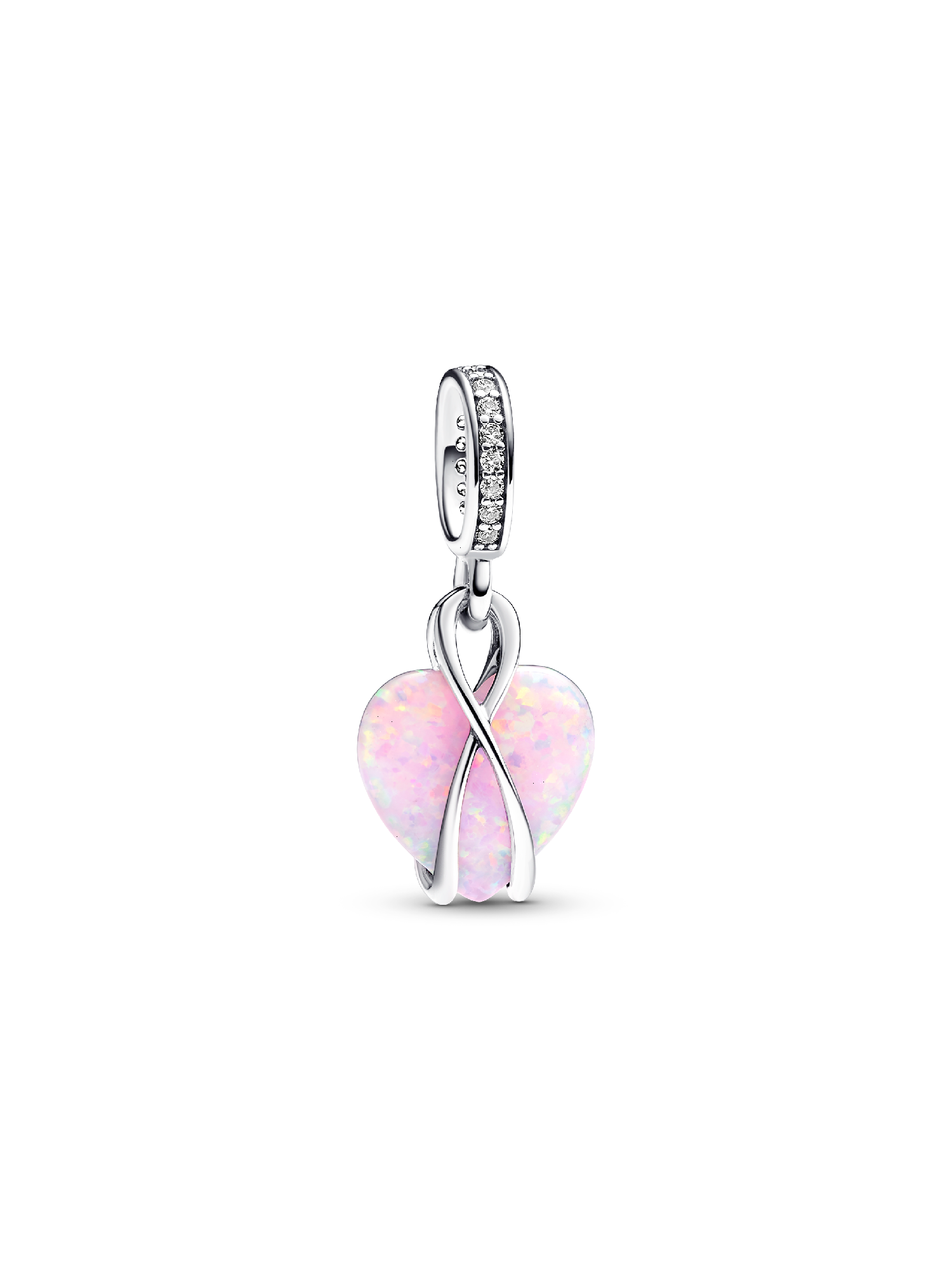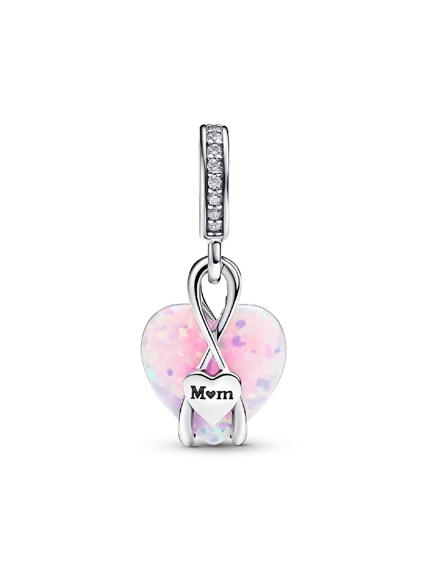 Celebrate your mom with the Pandora Mom Opalescent Heart Dangle Charm. Crafted in sterling silver, this heart-warming charm features a heart-shaped pink lab-created opal, adorned with a spectrum of colors and glittering streaks. The intricate design features overlapping silver lines forming a jump ring, a delicate heart-shaped disc engraved with 'Mom,' and a row of pavé for added shine. Celebrate the beauty of motherhood with a charm that captures its richness and multi-faceted stories.