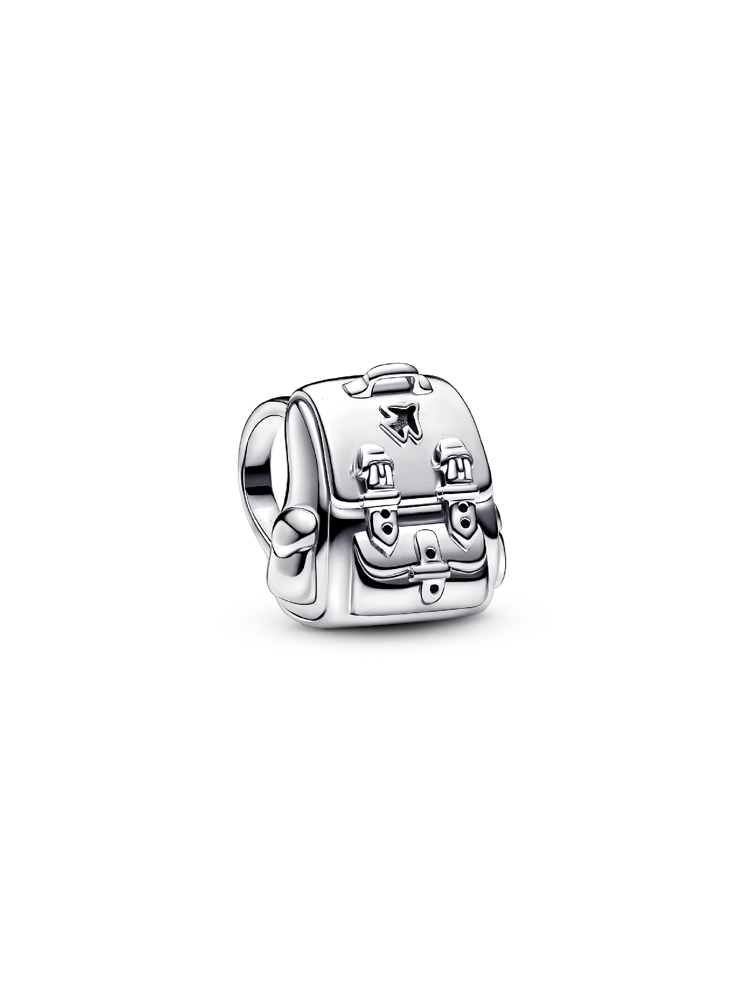 Heed the call for adventure with the Adventure Backpack Charm. A scaled-down sterling silver backpack features realistic details including wraparound straps, handle, buckles and pocket. An airplane symbol is imprinted on the front and a message is engraved on the underside: "Life is for adventure." An important and wise reminder in the form of an irreverent charm, this charm also wraps gracefully over any carrier you wear it with for a uniquely playful styling element.