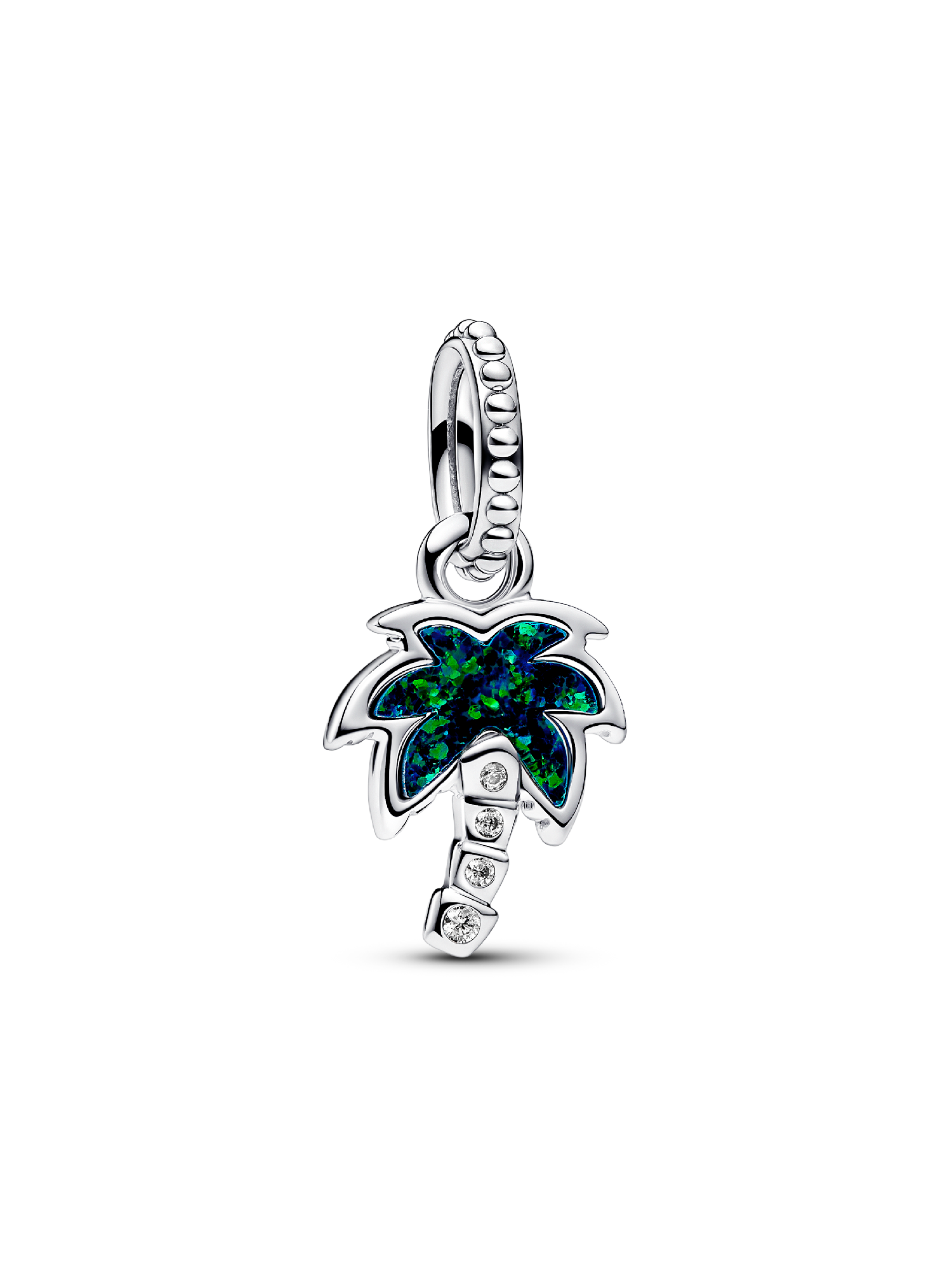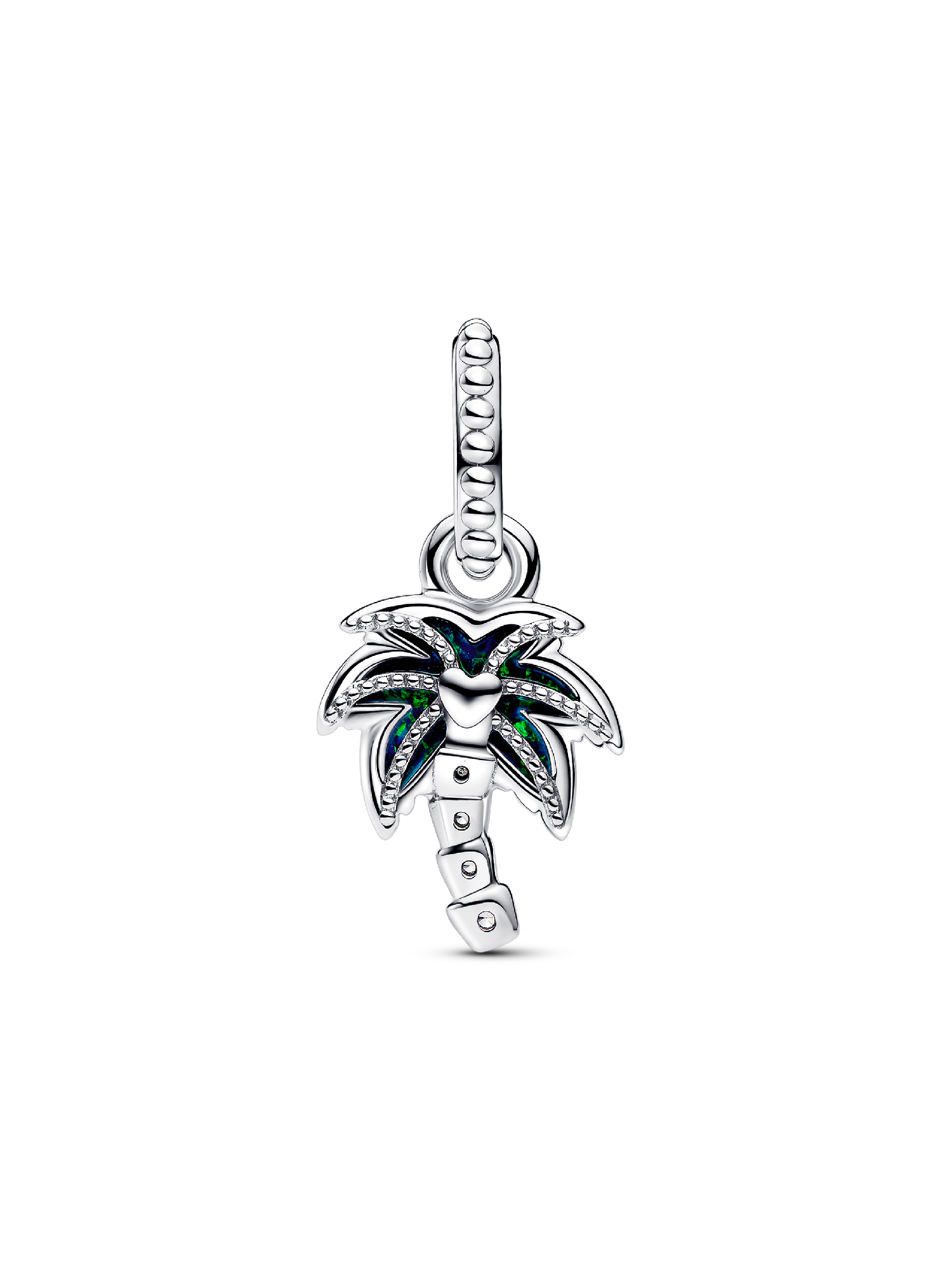 Bring an easy-breezy touch to your look with the Opalescent Green Palm Tree Dangle Charm. This sterling silver charm shaped like a palm tree features a lab-created opal with a glitter-streaked spectrum of green and blue hues on one side. On the other side, a raised heart is centered within a cut-out frame. The palm tree's curved base is punctuated with sparkling stones. Accessorize any look with this tropical-inspired charm for a dose of feel-good island energy anywhere, anytime.