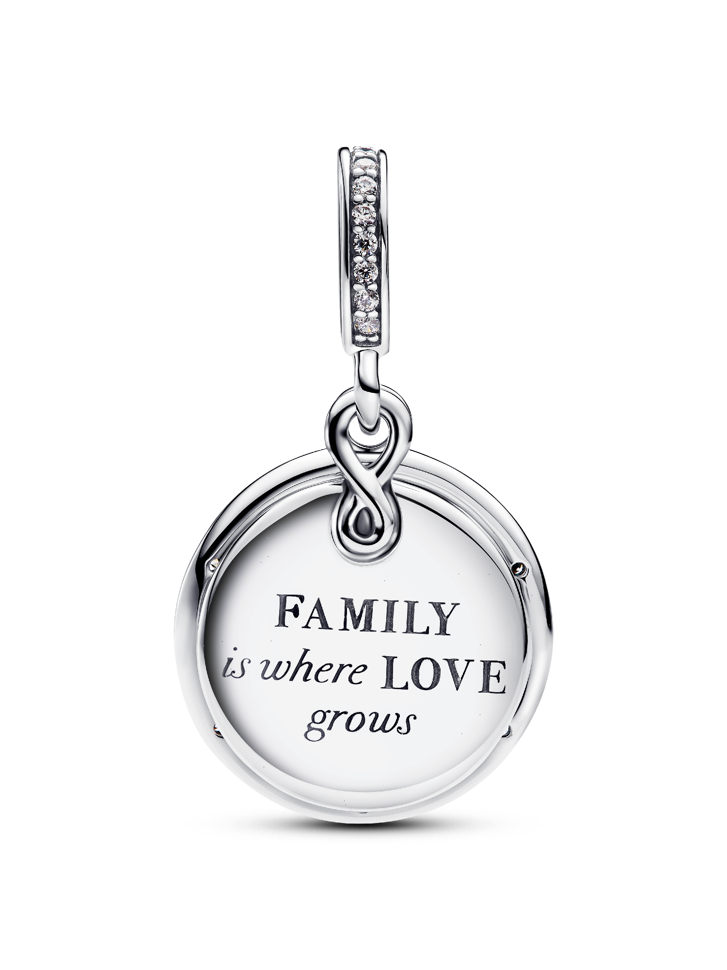 Love and family light the way with our Glow-in-the-dark Infinity Tree Double Dangle Charm. Crafted in sterling silver, one dangle features an infinity tree to represent our never-ending connections. The other shines with glow-in-the-dark enamel and the engraved message "FAMILY is where LOVE grows." Add it to your collection as a symbol of your roots and a reminder to bloom where you are planted.