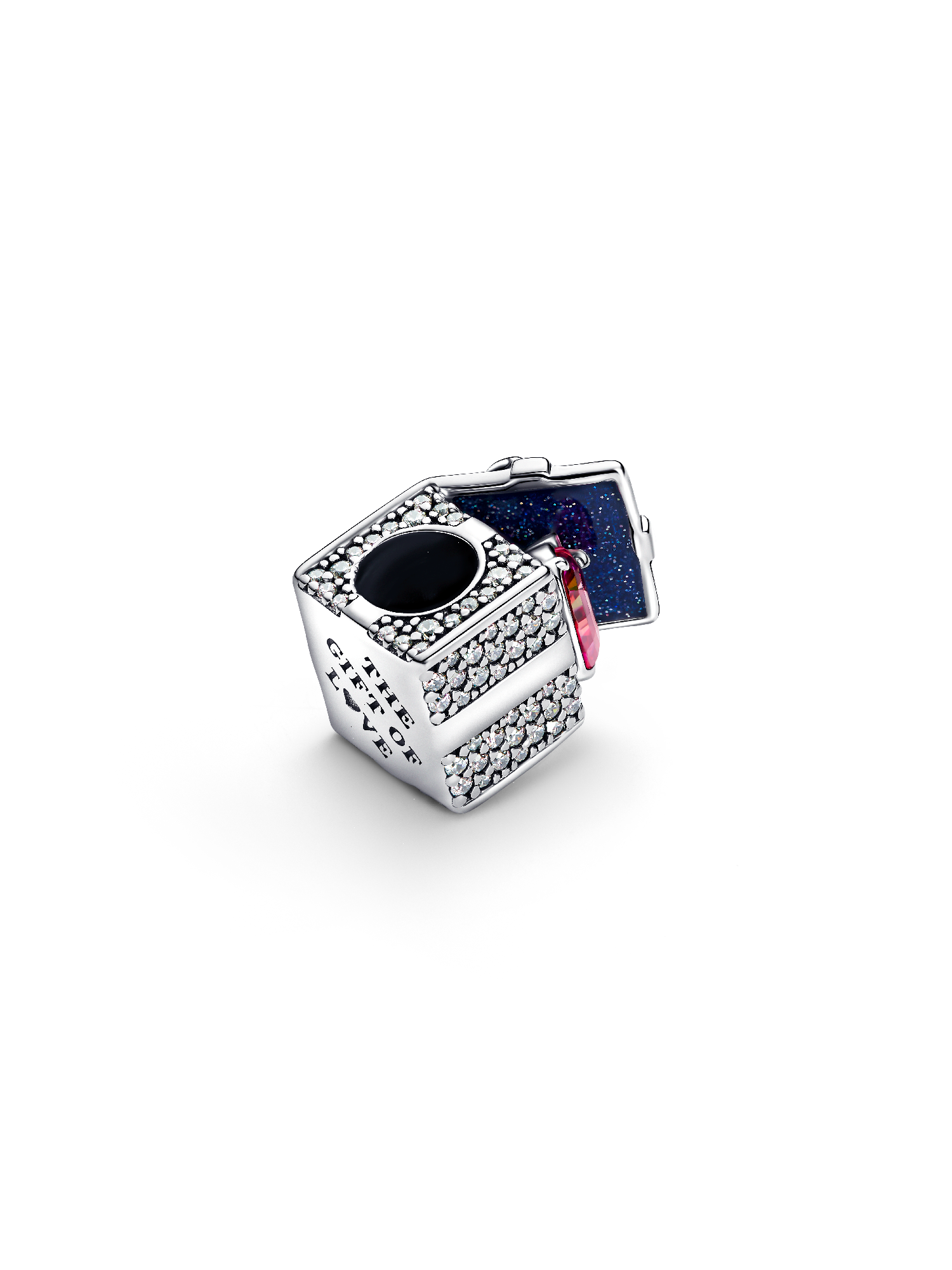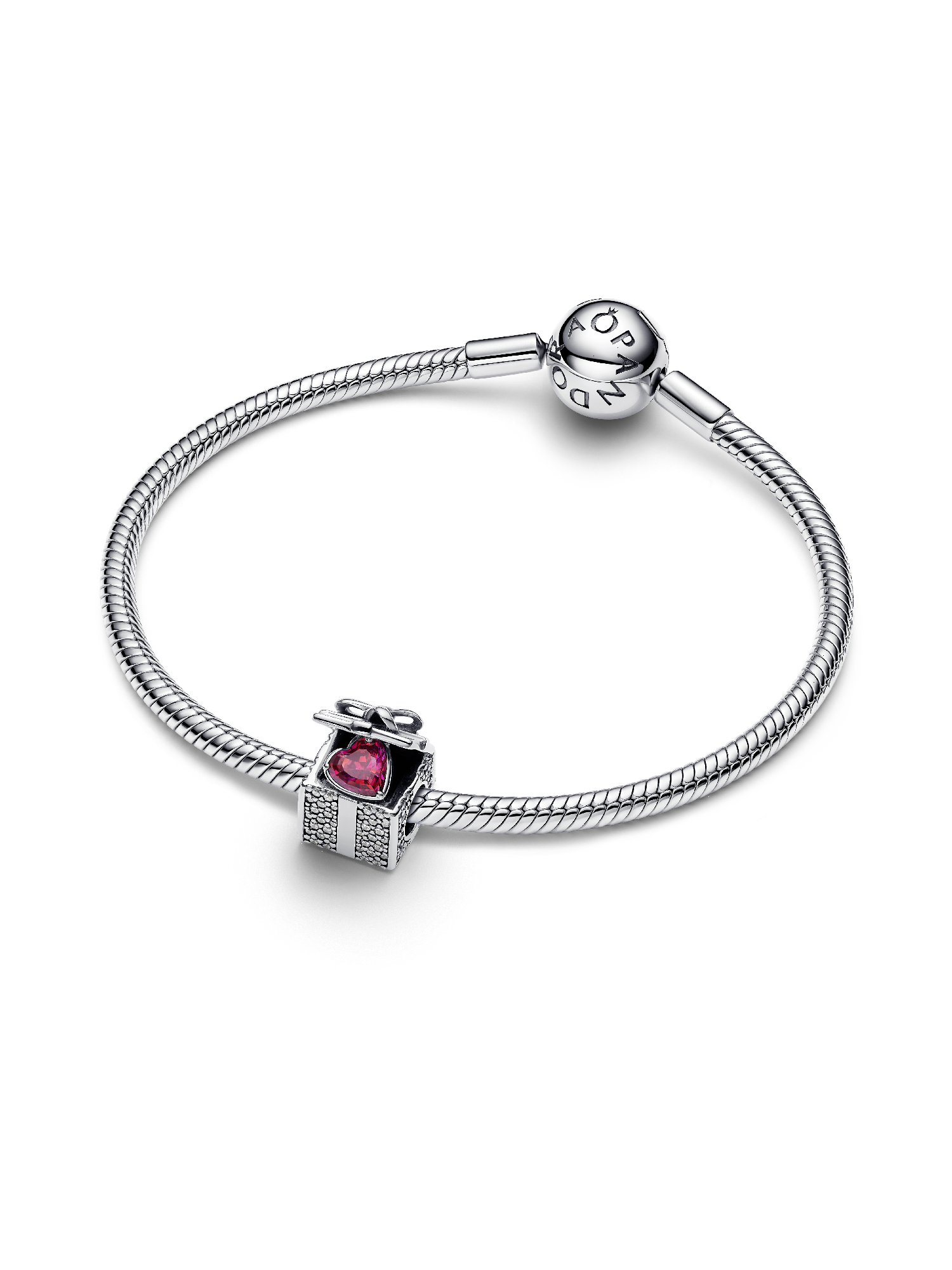 Unbox the holidays with our Sparkling Gift Box Charm. The open sterling silver box is complete with a bow, ribbon details, glittering pavé and a radiant red heart-shaped stone. The bottom of the box features the engraved message ""THE GIFT OF L♥VE." Perfect for surprising your loved ones during the holidays or as a symbol of holiday cheer for yourself.