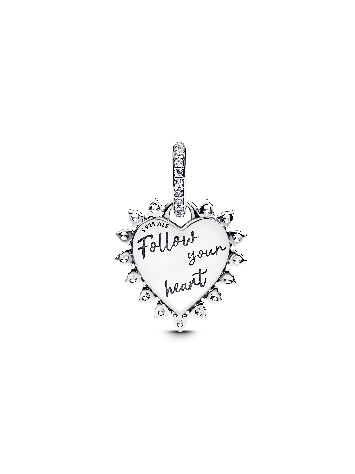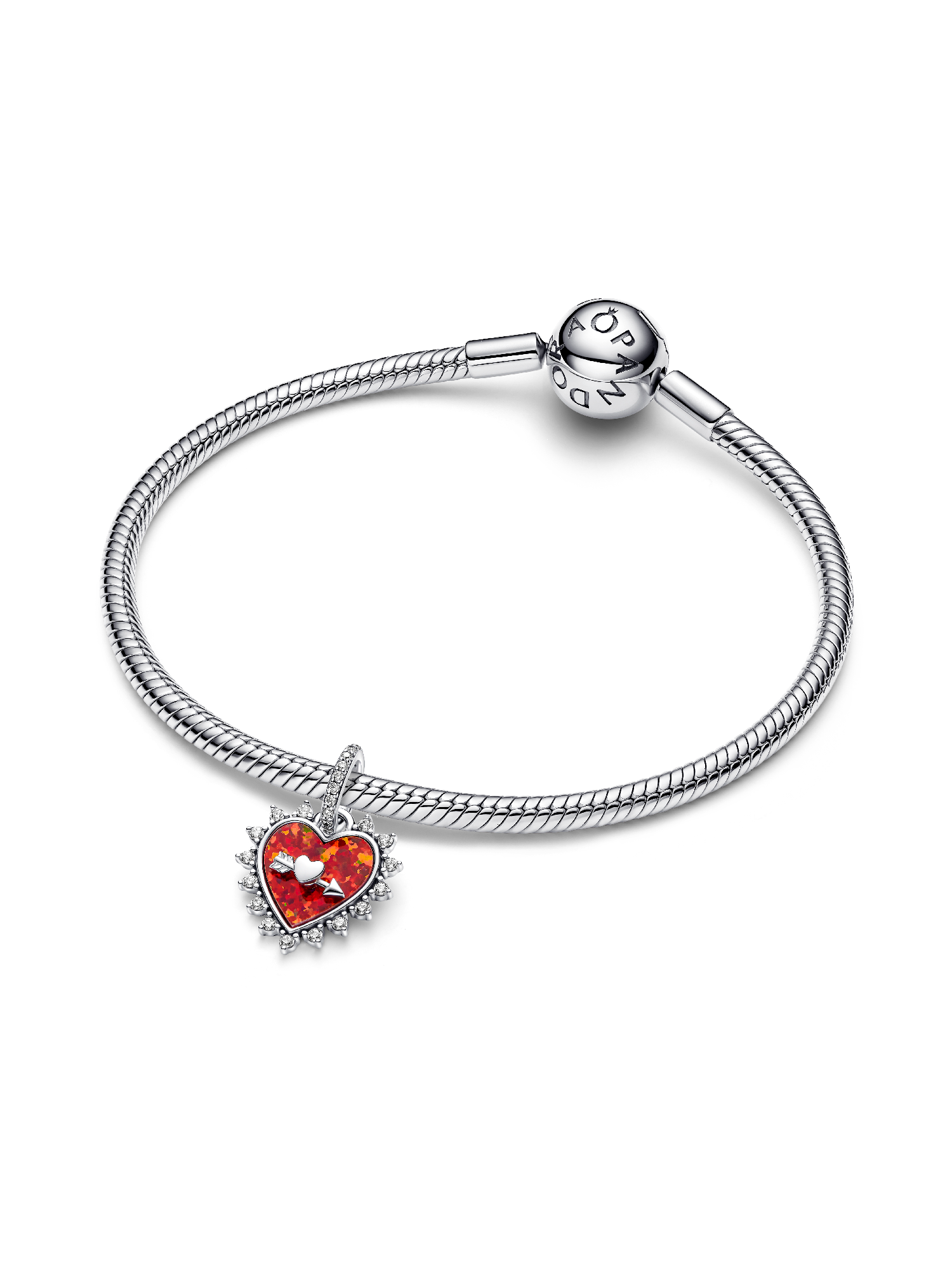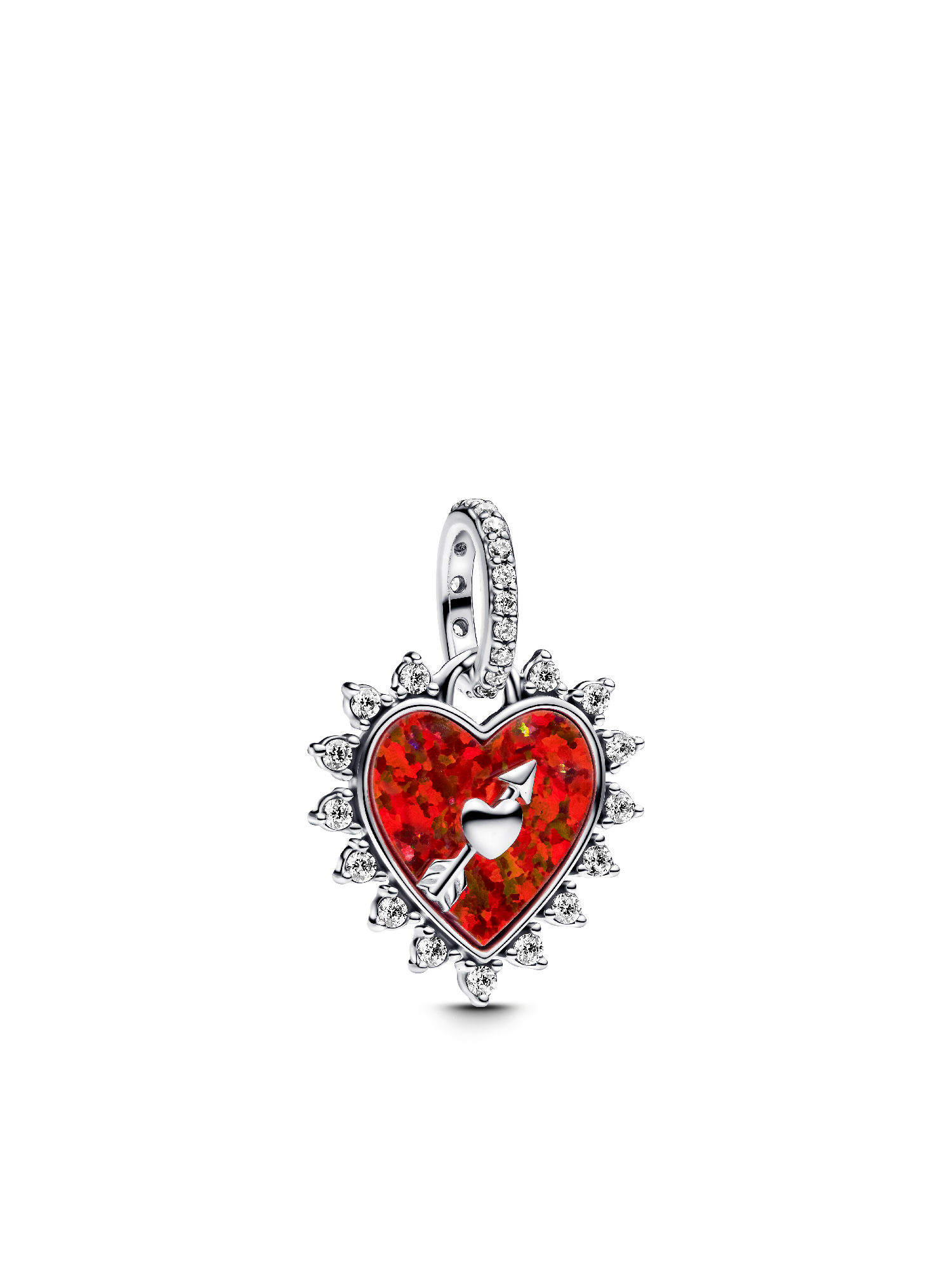 Add a playful twist to your style with the Spinnable Arrow Heart Dangle Charm. Crafted from sterling silver, it features a red lab-created opal heart framed by shimmering clear cubic zirconia stones. The sterling silver arrow spins around, and the back of the heart is engraved with "Follow your heart". The pavé-set stones on the bail add just the right amount of sparkle. Wear this charm on a bracelet or necklace as a reminder to follow your heart, every day.