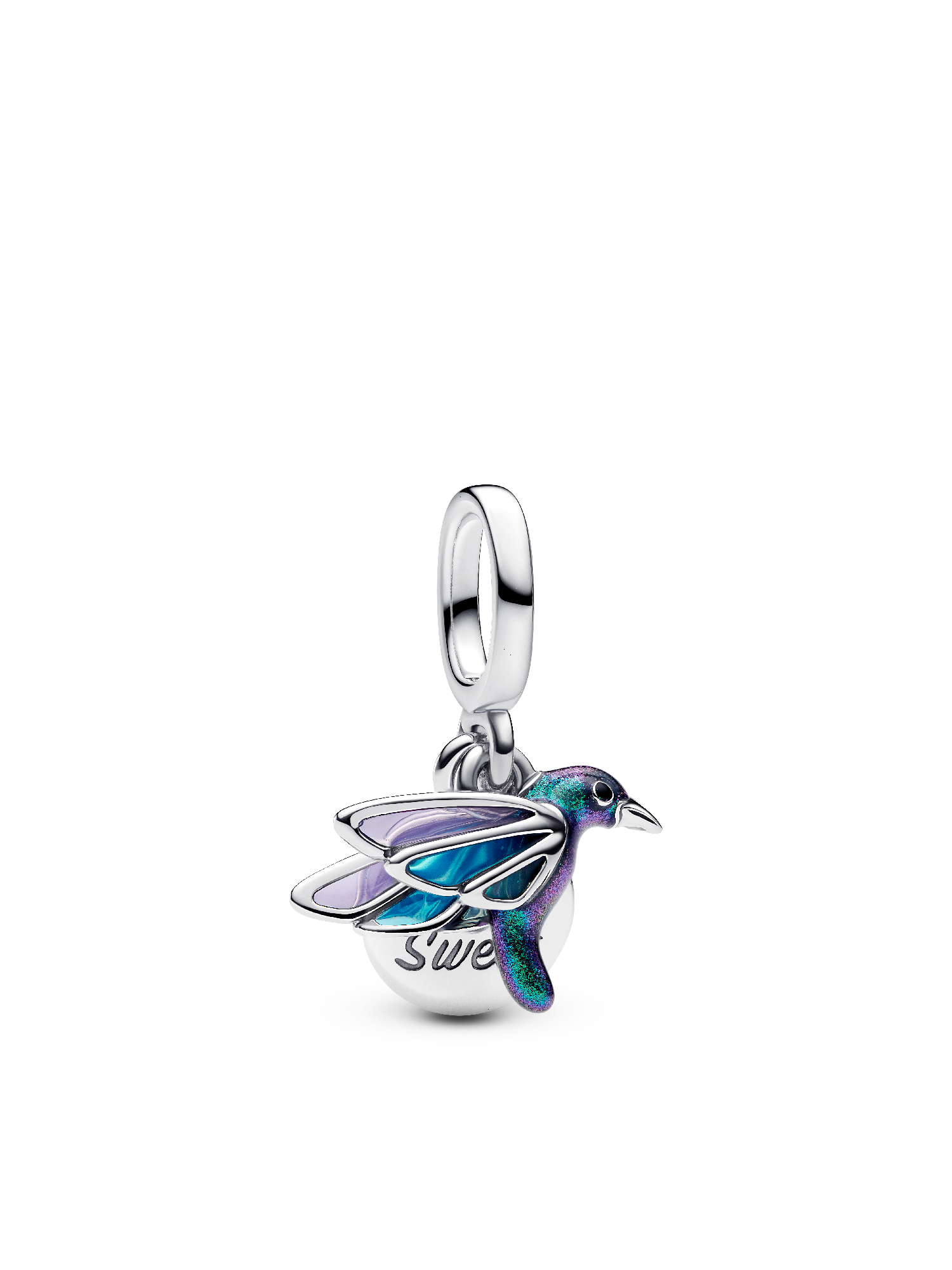 This shimmering hummingbird charm is crafted from sterling silver and features the message "Life is Sweet". Transparent enamel wings and iridescent enamel on the body capture the lightness and grace of a hummingbird in flight. Wear it on your favourite charm bracelet, necklace or earrings as a reminder to savour life's sweet moments.