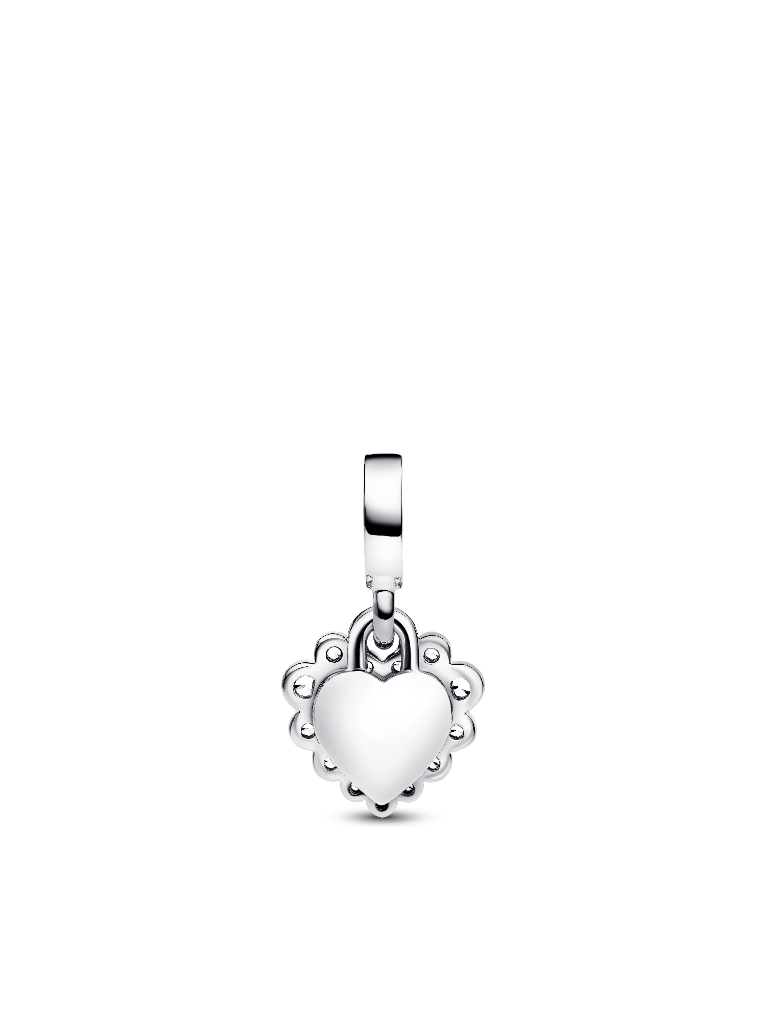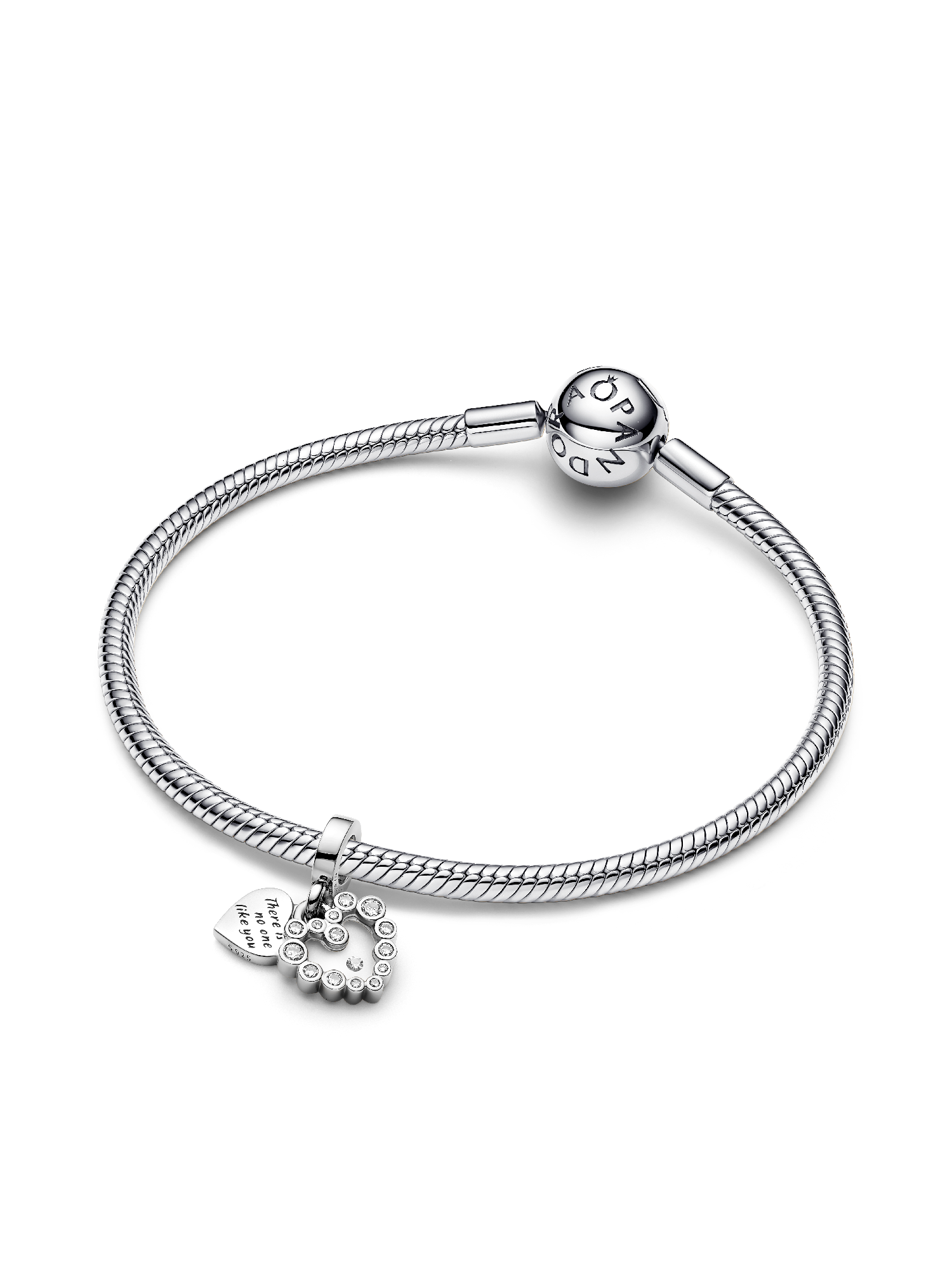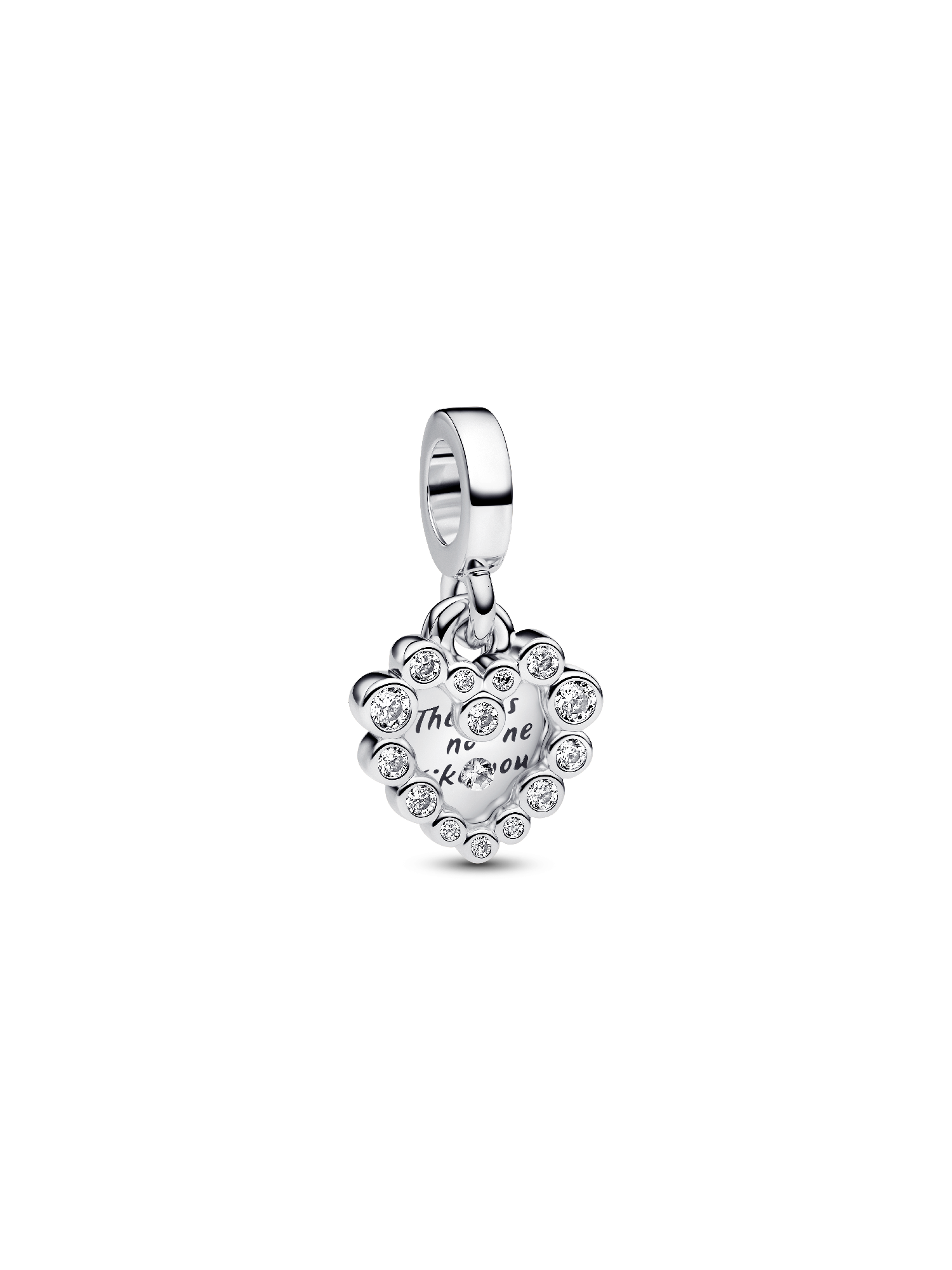 Make your feelings known with the Sparkling Heart Double Dangle Charm. This sterling charm has two separate heart-shaped dangles. Sparkling stones form a border around the front dangle, with a floating stone at centre set in transparent resin. The back dangle reads "There is no one like you." Inspired by motherhood in all its multifaceted expressions, this charm celebrates the power of a mother's love.