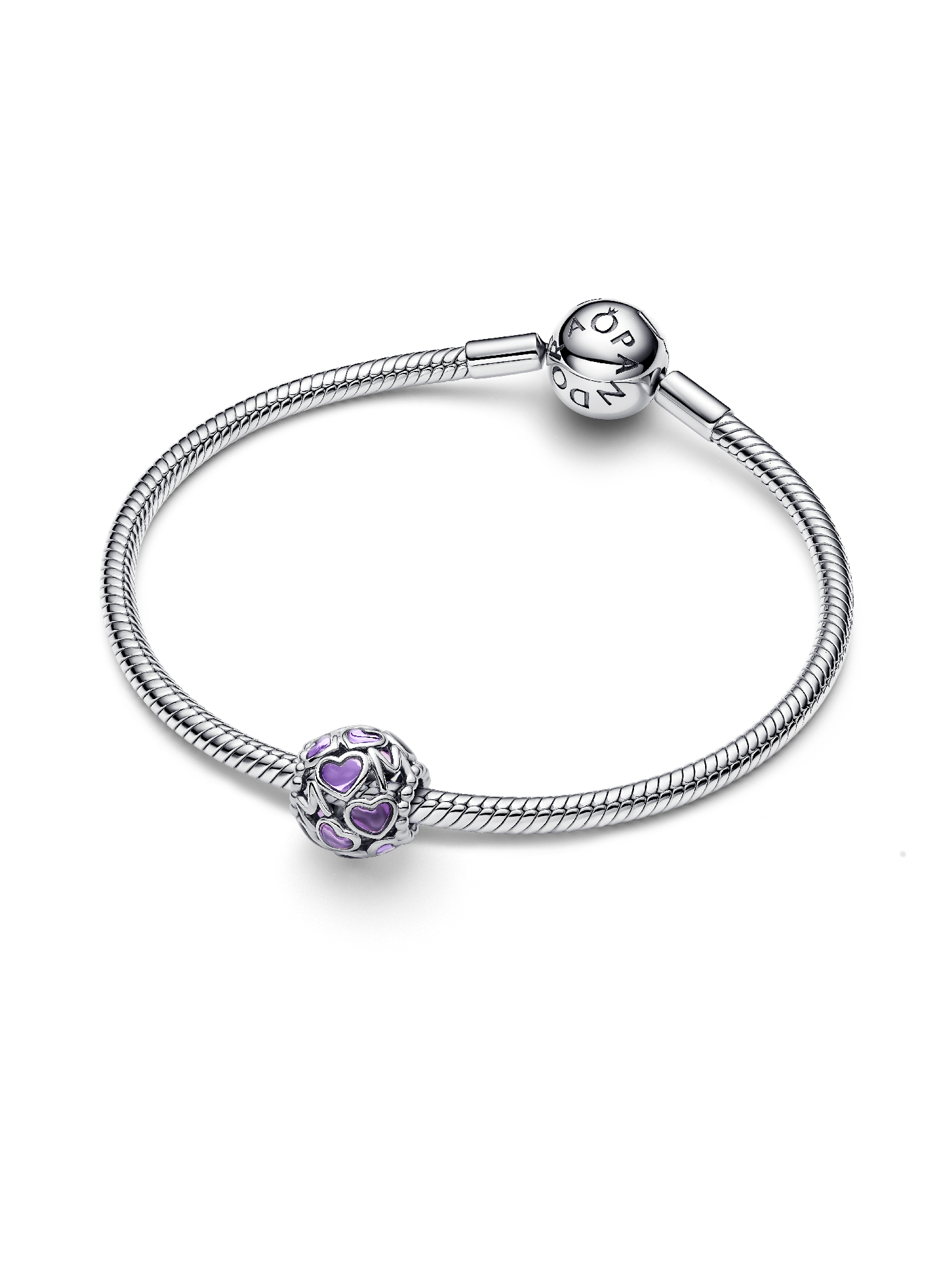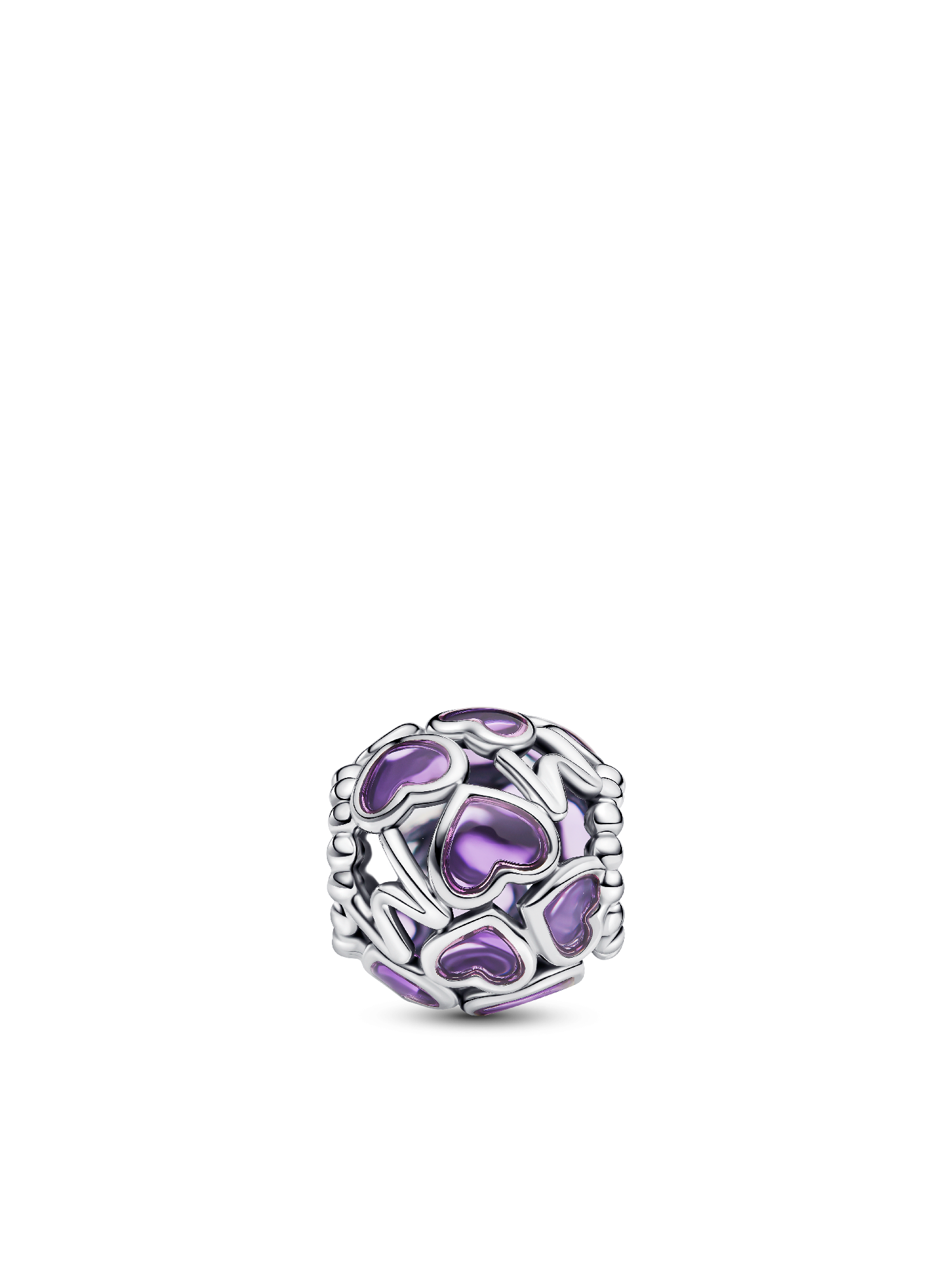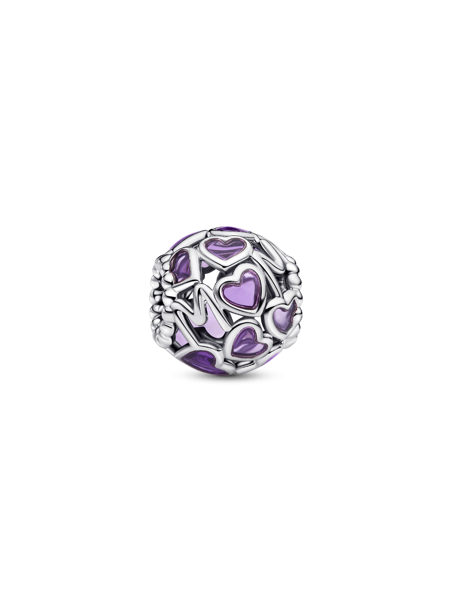 Add a cool-toned accent to your look with the Openwork Hearts Mom Charm. Transparent lavender enamel hearts with sterling silver borders form a round charm, which also features microbeads and the word "MOM" in large letters. Inspired by the sense of interconnnectedness we all share – and particularly the special bonds created by motherhood – this charm will remind you of the bonds that matter most.