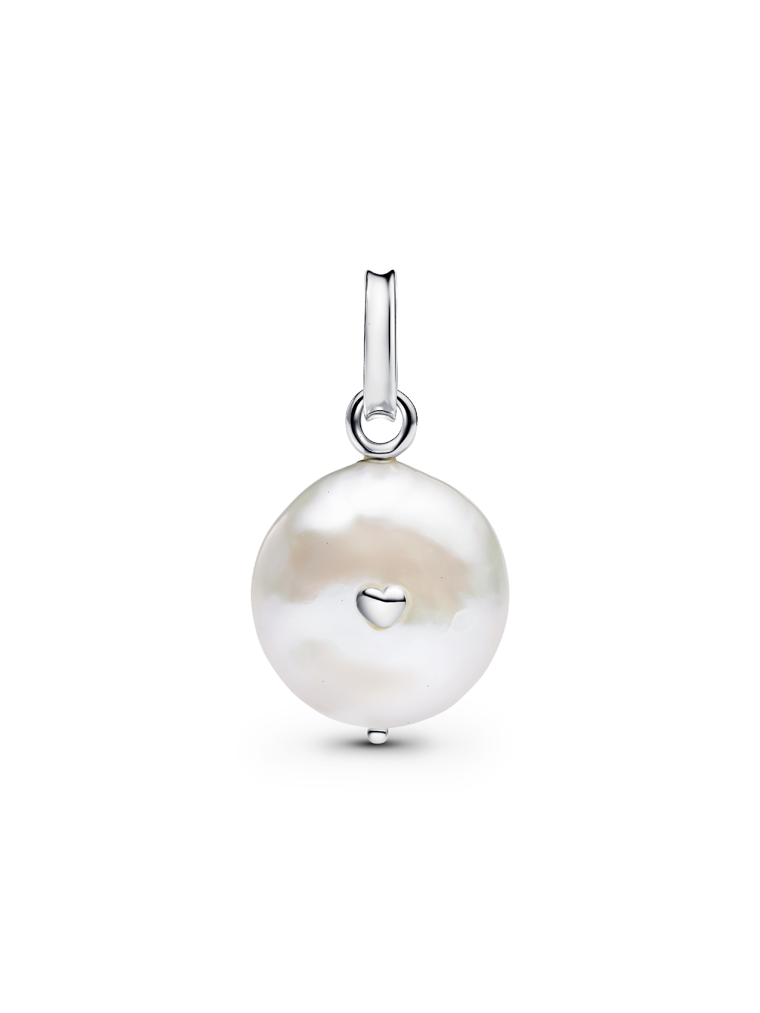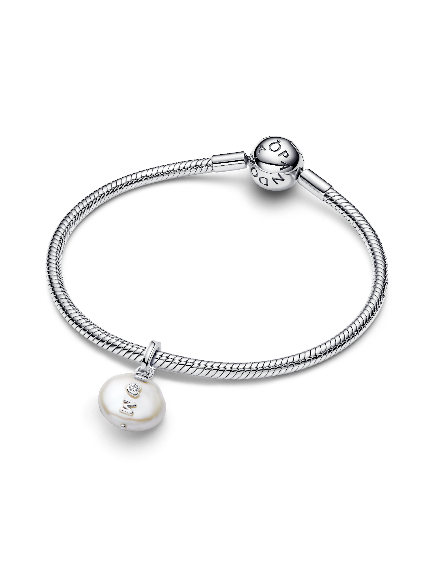 Celebrate Mom with the Treated Freshwater Cultured Baroque Pearl Mom Dangle Charm. This sterling silver charm centers on a treated freshwater cultured baroque pearl featuring the phrase M♥M, with a heart-shaped letter "O" set with a sparkling stone. Inspired by the beautiful truth that every mother is unique, just like a baroque pearl with its organic shape, this charm is the perfect reminder of the motherly bonds we cherish.