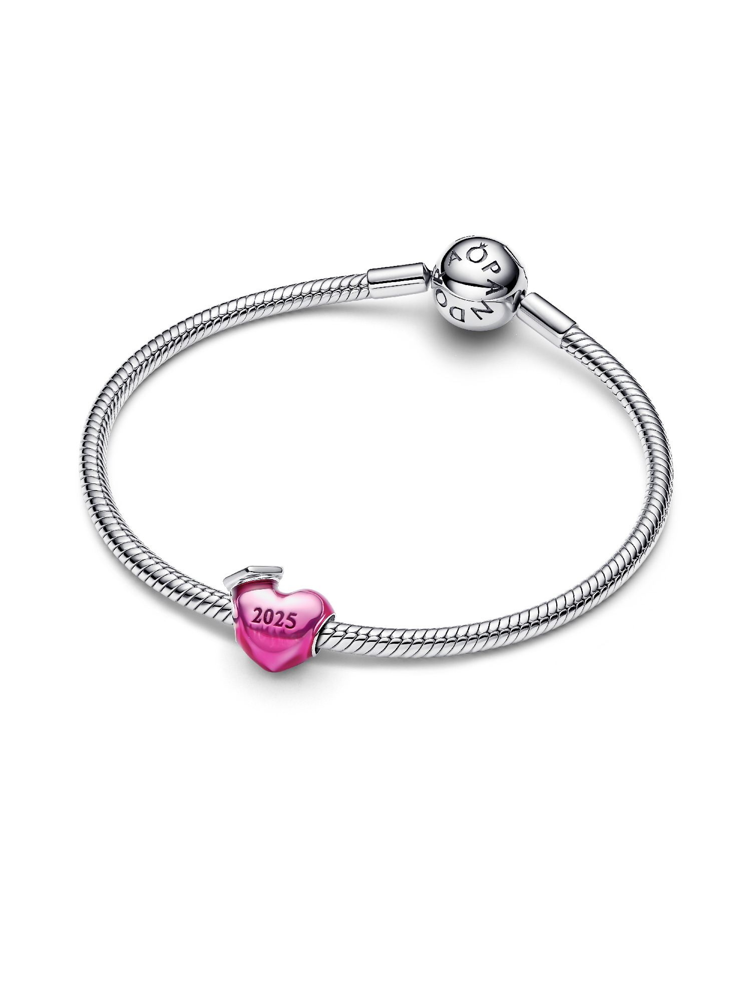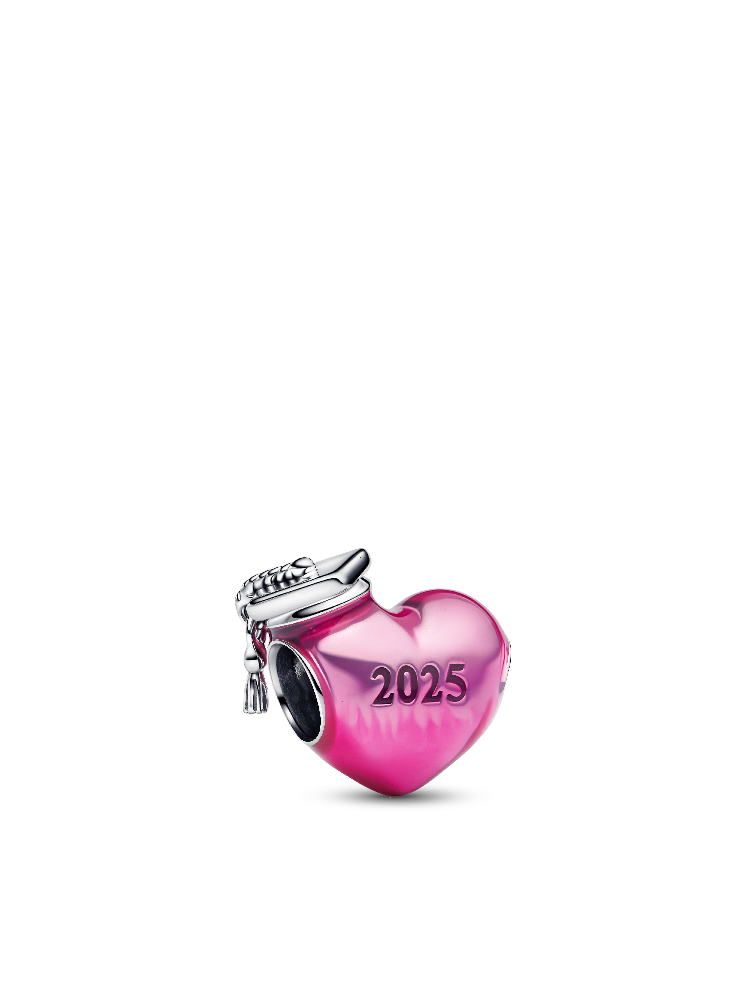 Mark the milestone in color with the Graduation 2025 Heart Charm. Hand-finished in sterling silver, this charm features a heart covered in transparent pink enamel with a graduation cap on top. One side of the charm is engraved with "2025" to make sure proud graduates never forget their big accomplishment. The cap's dangling tassel adds a jaunty, playful touch. Inspired by the hard work and dedication of students, this charm celebrates their success in style.