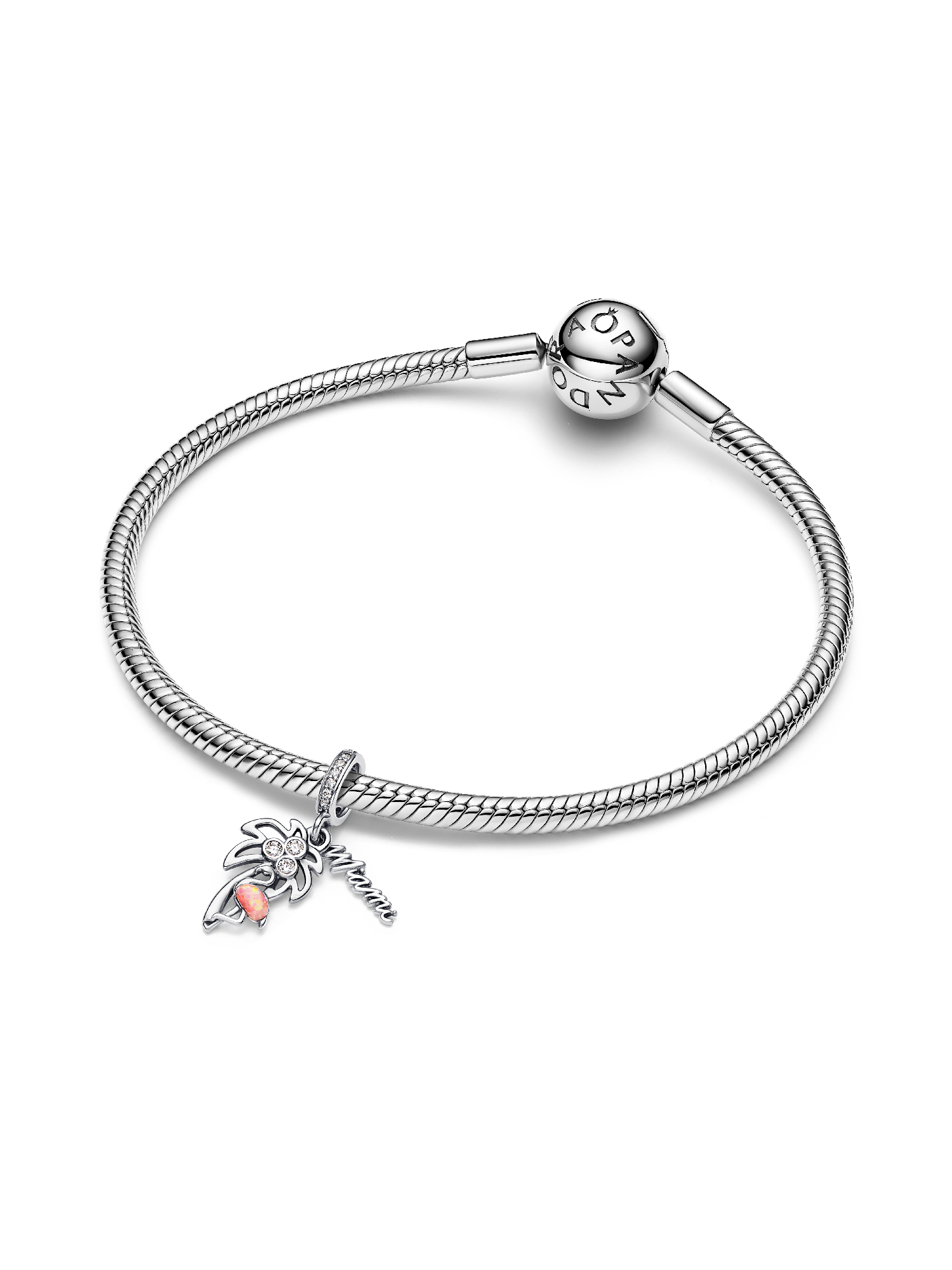 Celebrate the magic of Miami with a palm tree, flamingo, and handwritten 'Miami' script, all set with stones and enamel details.