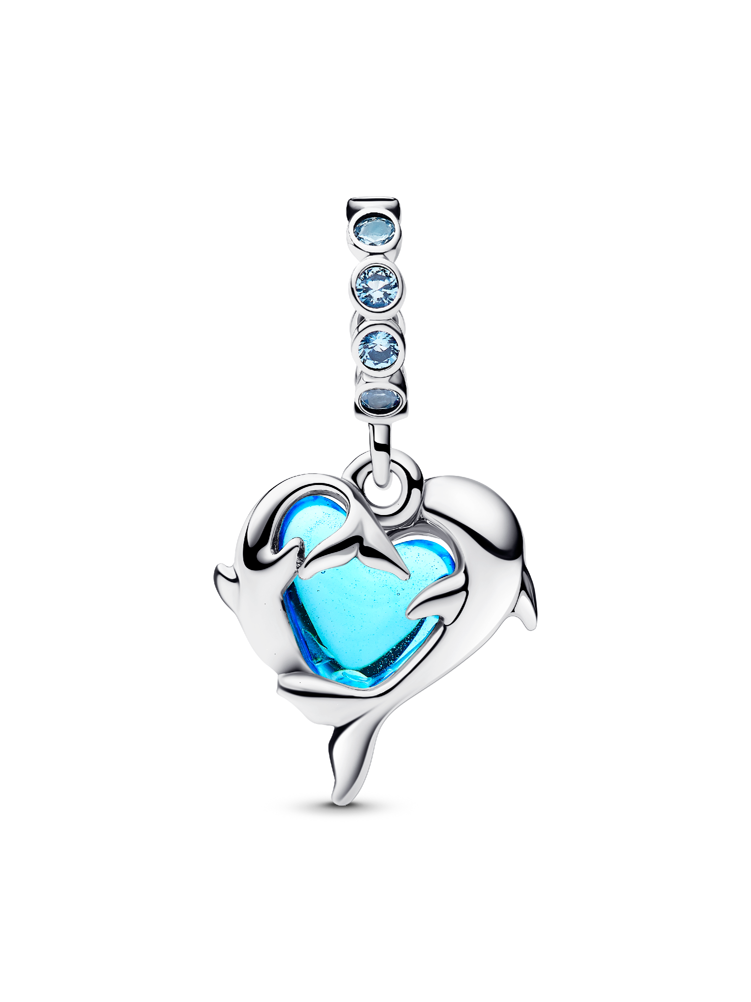 Dive into the world of playful guardians of the sea with this charming dangle, where two dolphins dance around a beautiful Murano glass heart.