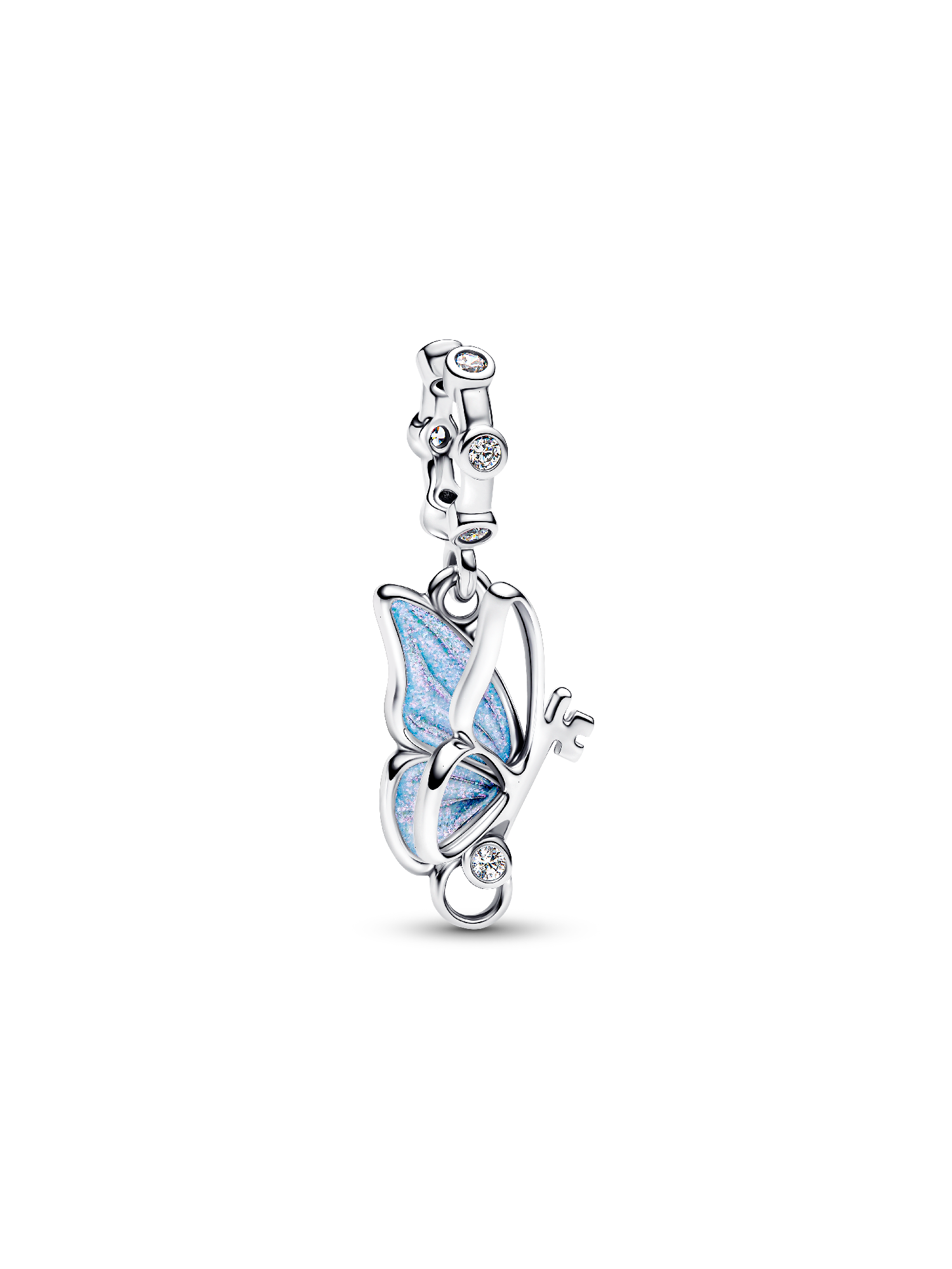 Unlock your dreams with our sterling silver Winged Dangle Charm. The butterfly’s head and body form a key. One wing has an openwork design, while the other features shimmering enamel and the engraved message 'UNLOCK TOMORROW'.