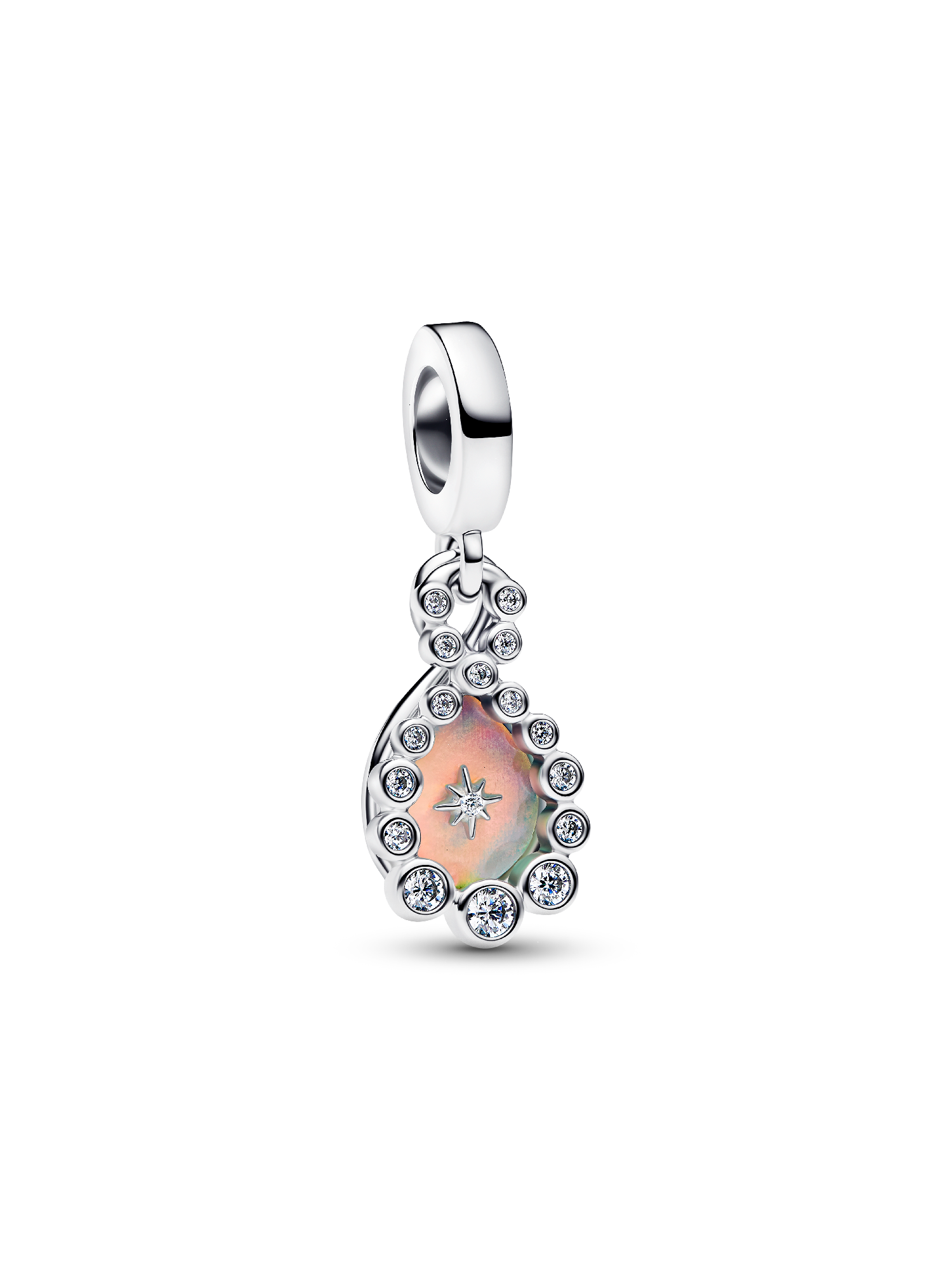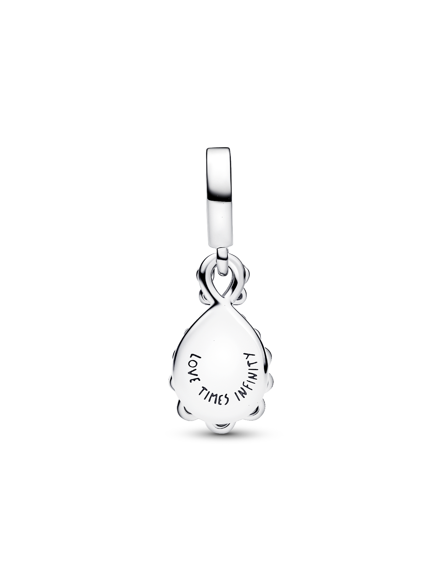 This sterling silver double dangle sparkles with clear cubic zirconia on one charm and aurora lab-grown opal resin on the other. Engraved with 'LOVE TIMES INFINITY', wear it as a reminder of everlasting connections.