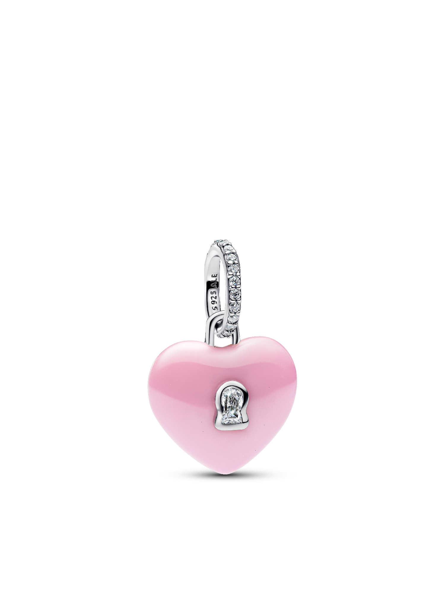Keep love under lock and key. This sterling silver dangle features a pink ceramic heart with clear cubic zirconia, a keyhole-shaped stone, and an engraved disc reading “YOURS.”