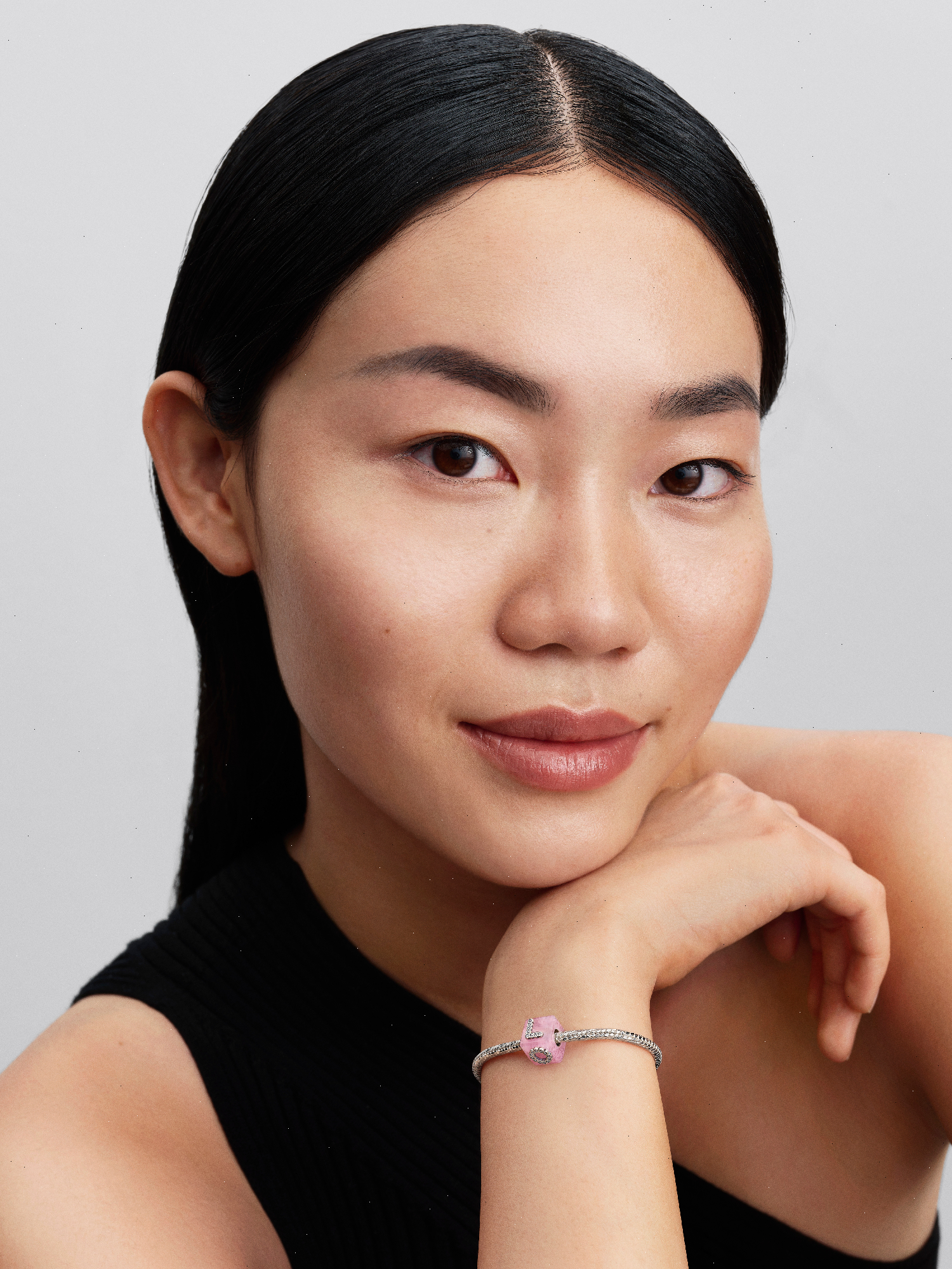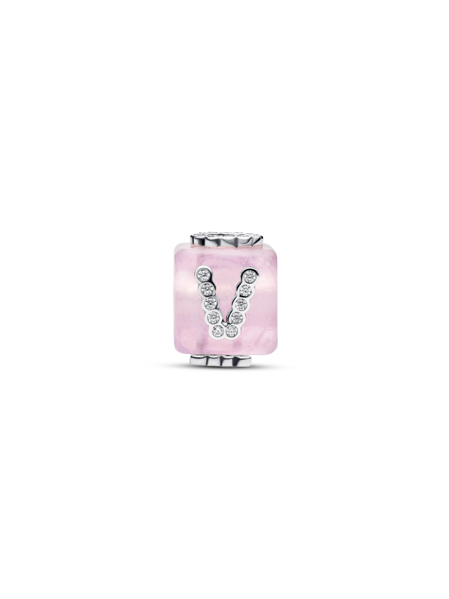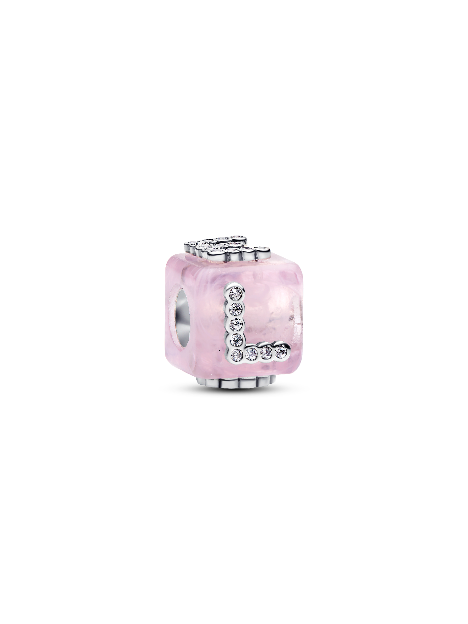 Say it from every side. This sterling silver charm features a pink Murano glass cube with the word “LOVE,” each letter set with clear cubic zirconia – simple, strong, and full of heart.