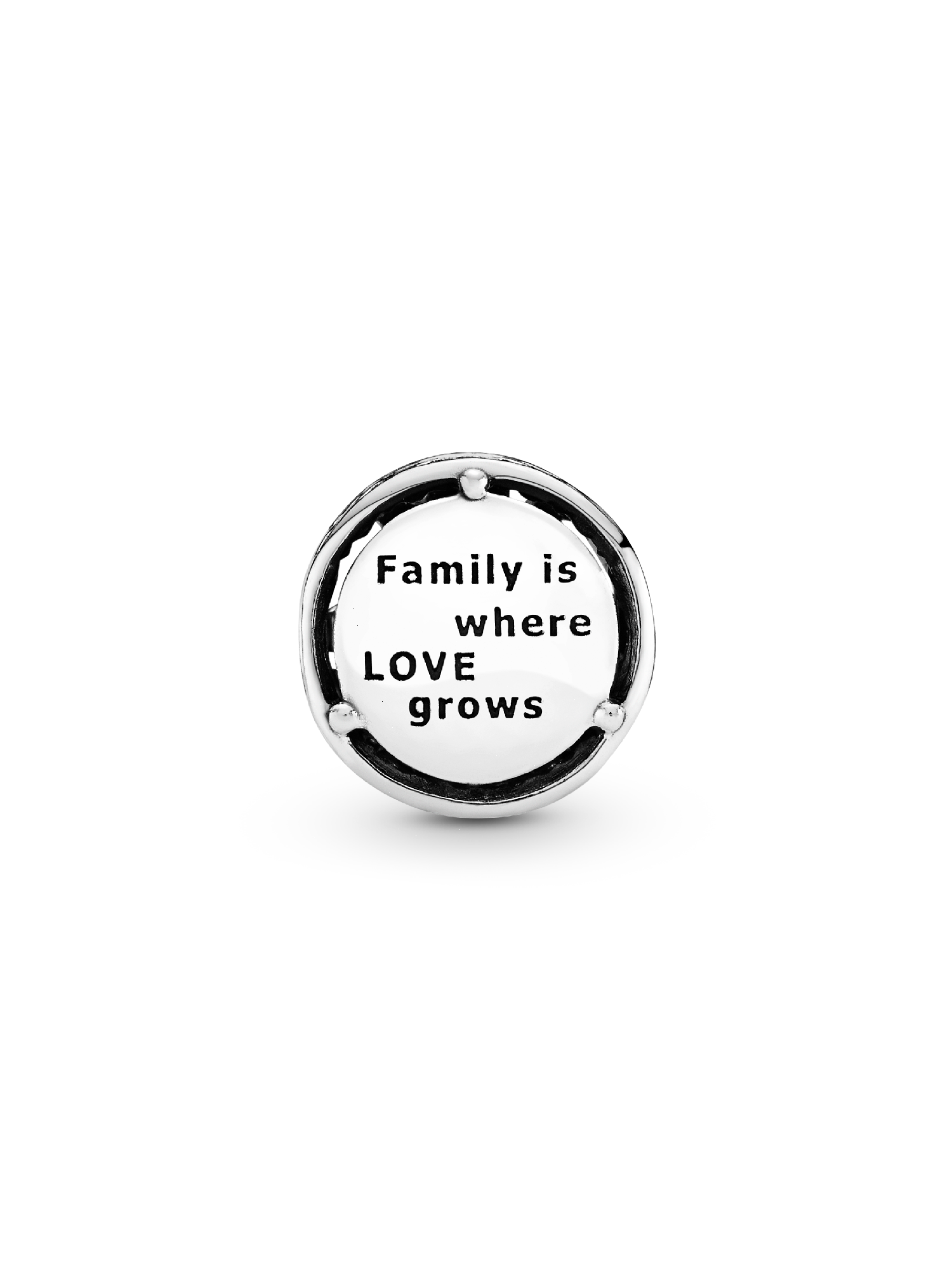 The family tree is a symbol of your growing family and the bonds you share, and this timeless charm in sterling silver is a keepsake of family love. The intricately crafted style is made from sterling silver and engraved with the message "Family is where love grows." Add yours to a Pandora Moments bracelet or bangle to keep memories of your family close to you. Or gift it to someone you share a precious bond with.