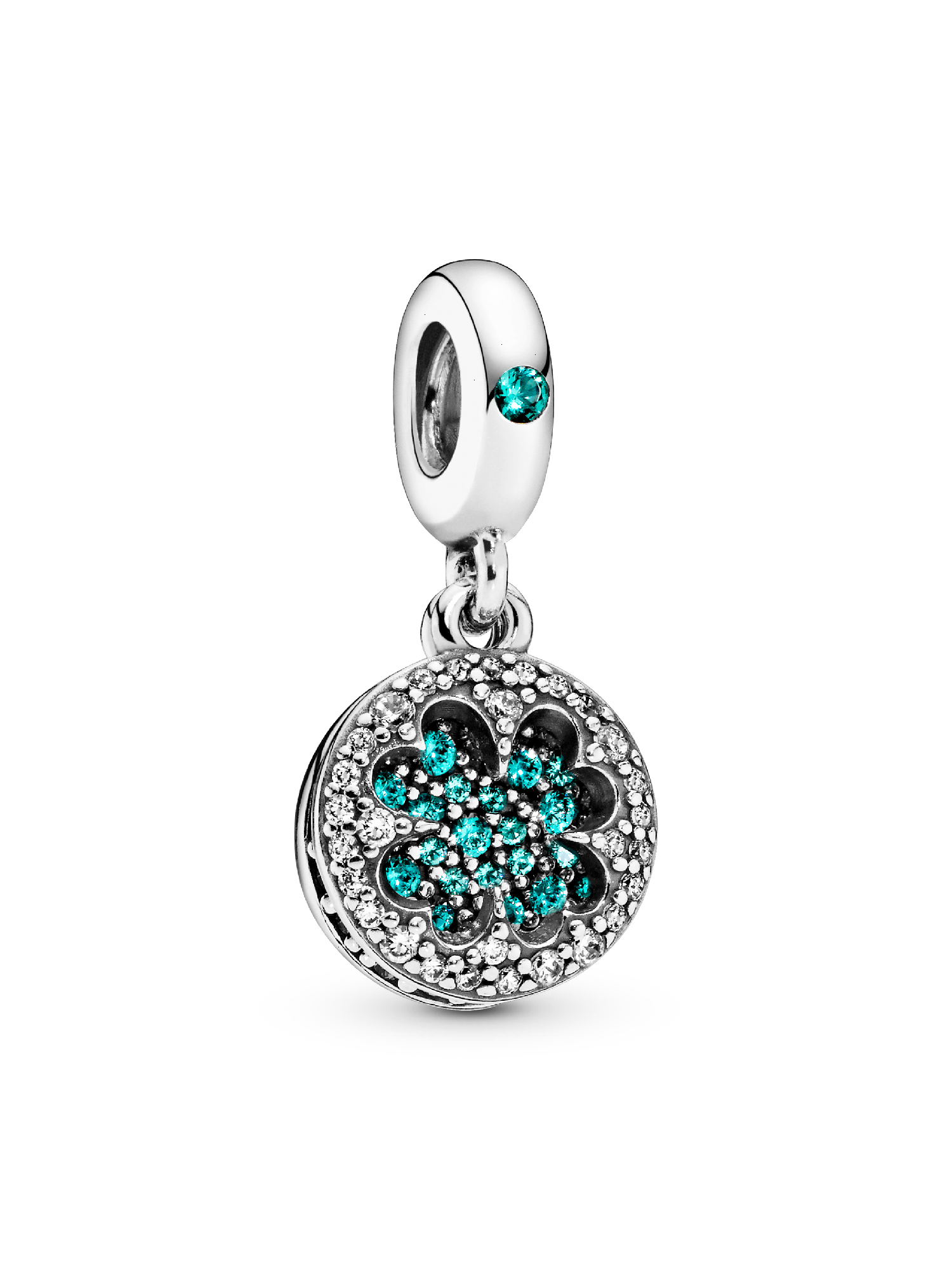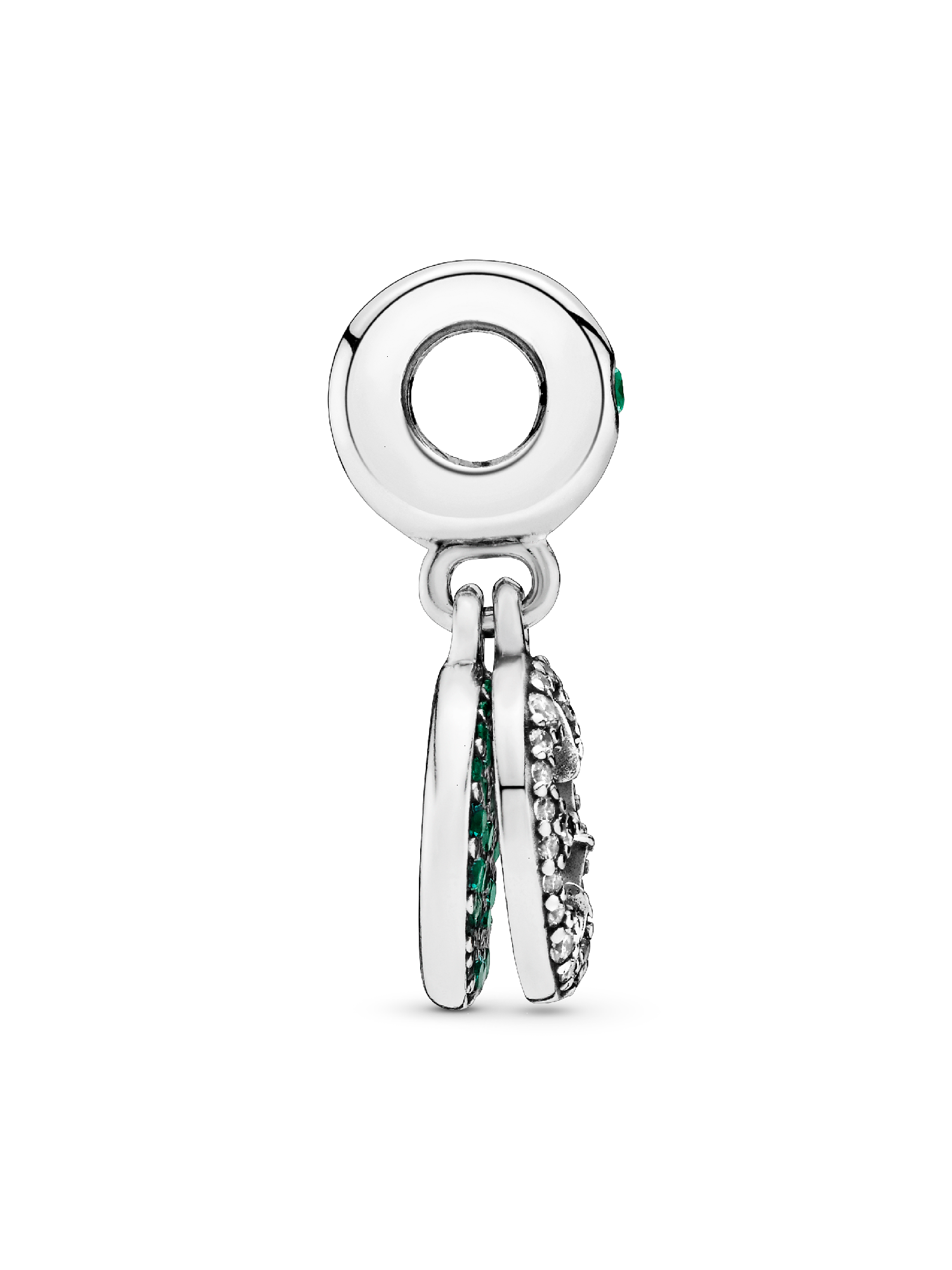 Feel lucky every day with this shimmering good luck charm. Set with clear cubic zirconia and green crystals, it brings meaning to your look and luck to your life. The sterling silver dangle charm is centered with a four-leaf clover. Wear it on your Pandora Moments bracelet as a symbol of your story or gift it to someone special as a lucky charm.