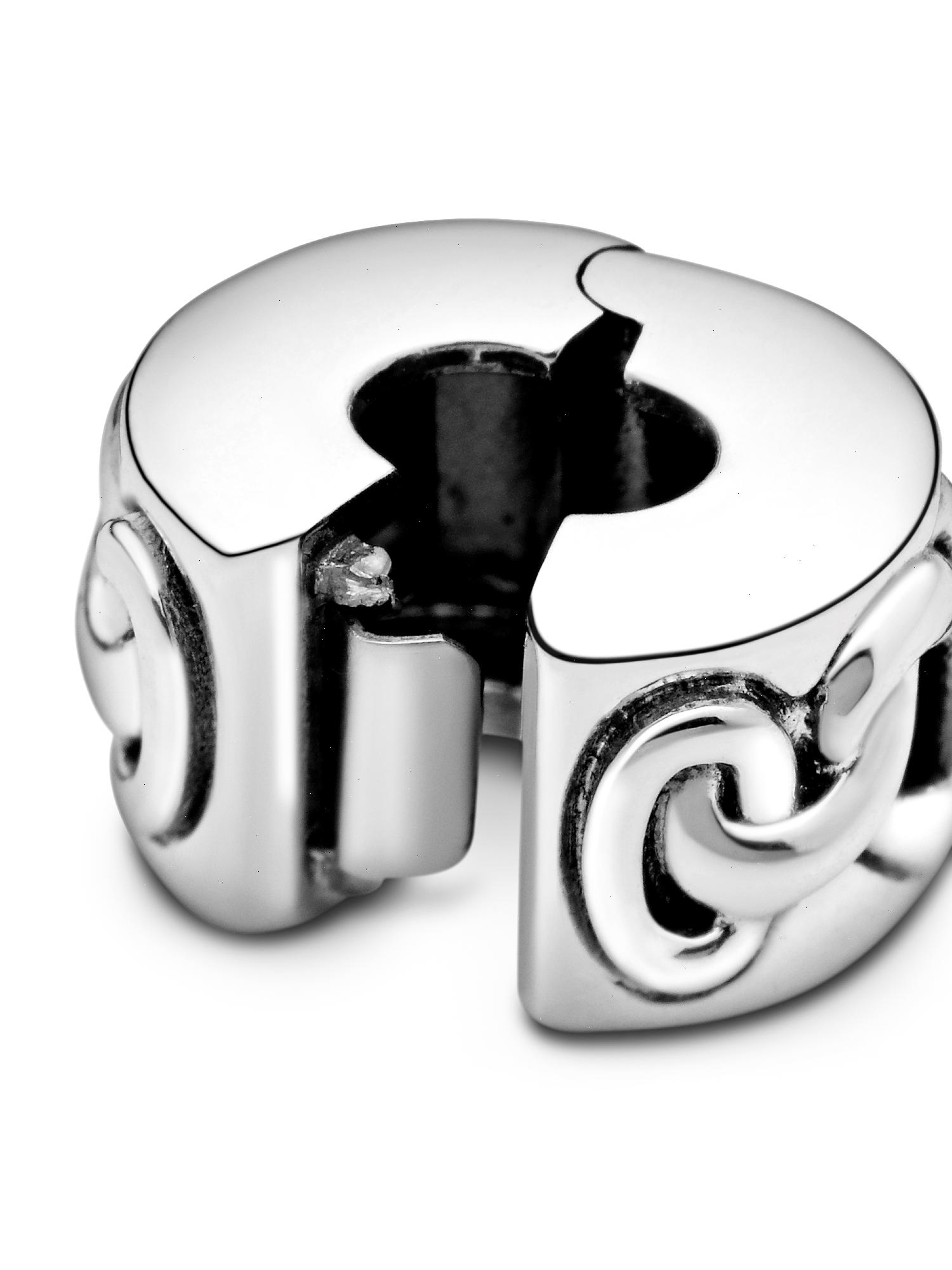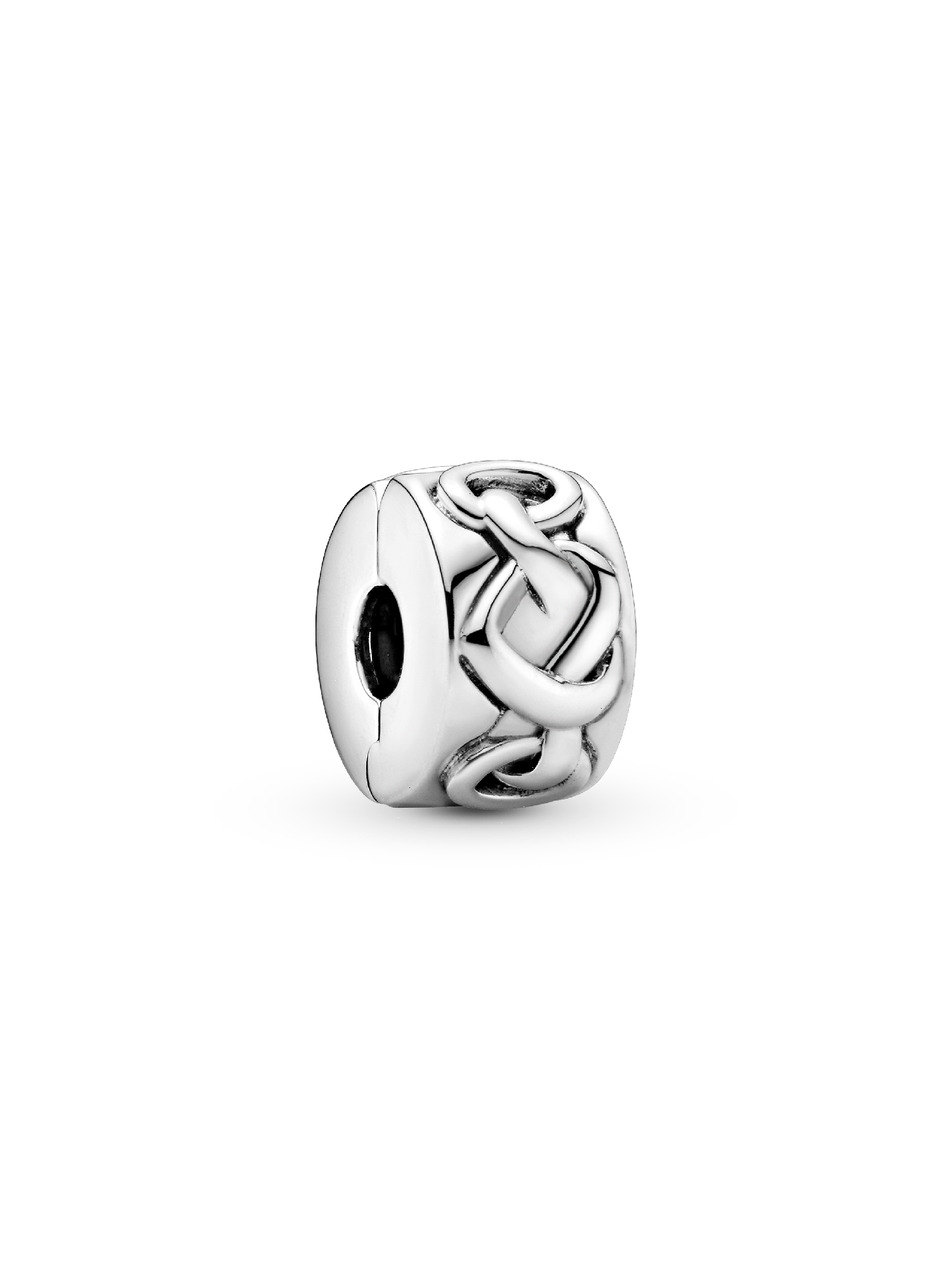 Our simple yet striking Pandora Moments clip charm is decorated with a row of knotted hearts. The design features a combination of the iconic heart and the classic love knot, which gives the piece extra emotional appeal. The sterling silver charm is perfect for adding a heartfelt touch to your bracelet collection and helps to evenly space out your stack. This clip charm features no silicone grip, so it will slide if not styled onto threads (two raised charm dividers).