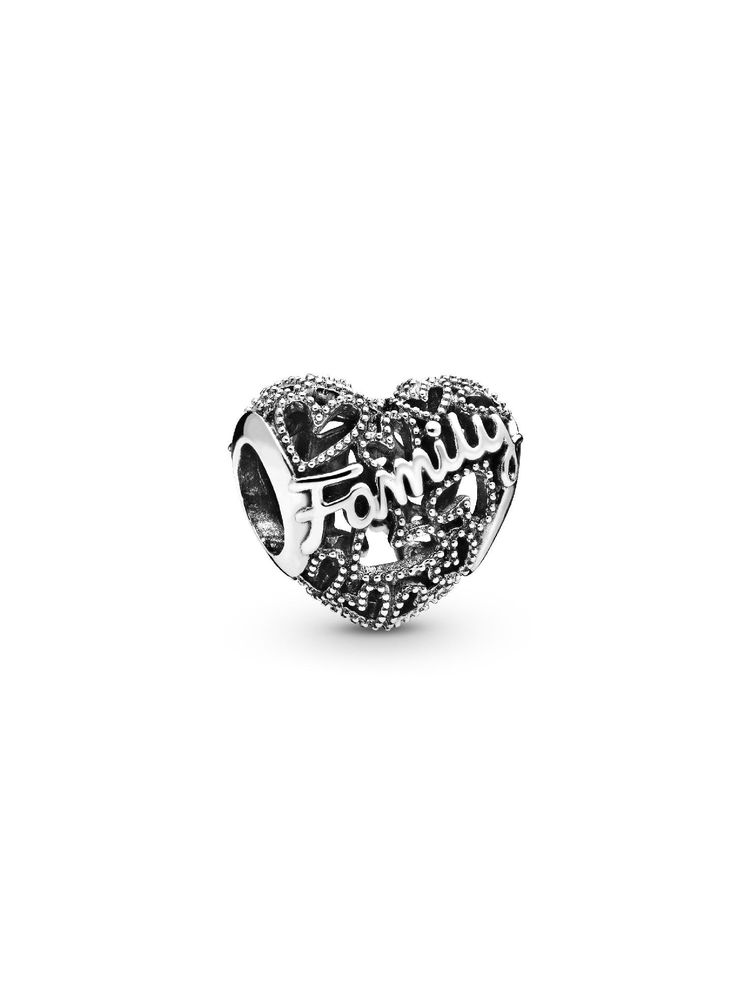 Near or far, your family is always in your heart wherever you are. Show off just how much your family means to you with this special heart-shaped charm with beaded openwork hearts all over and a script that sweetly reads "Family". Remind yourself of your nearest and dearest wherever you are or give it as a gift to one of your family members that holds a special place in your heart.