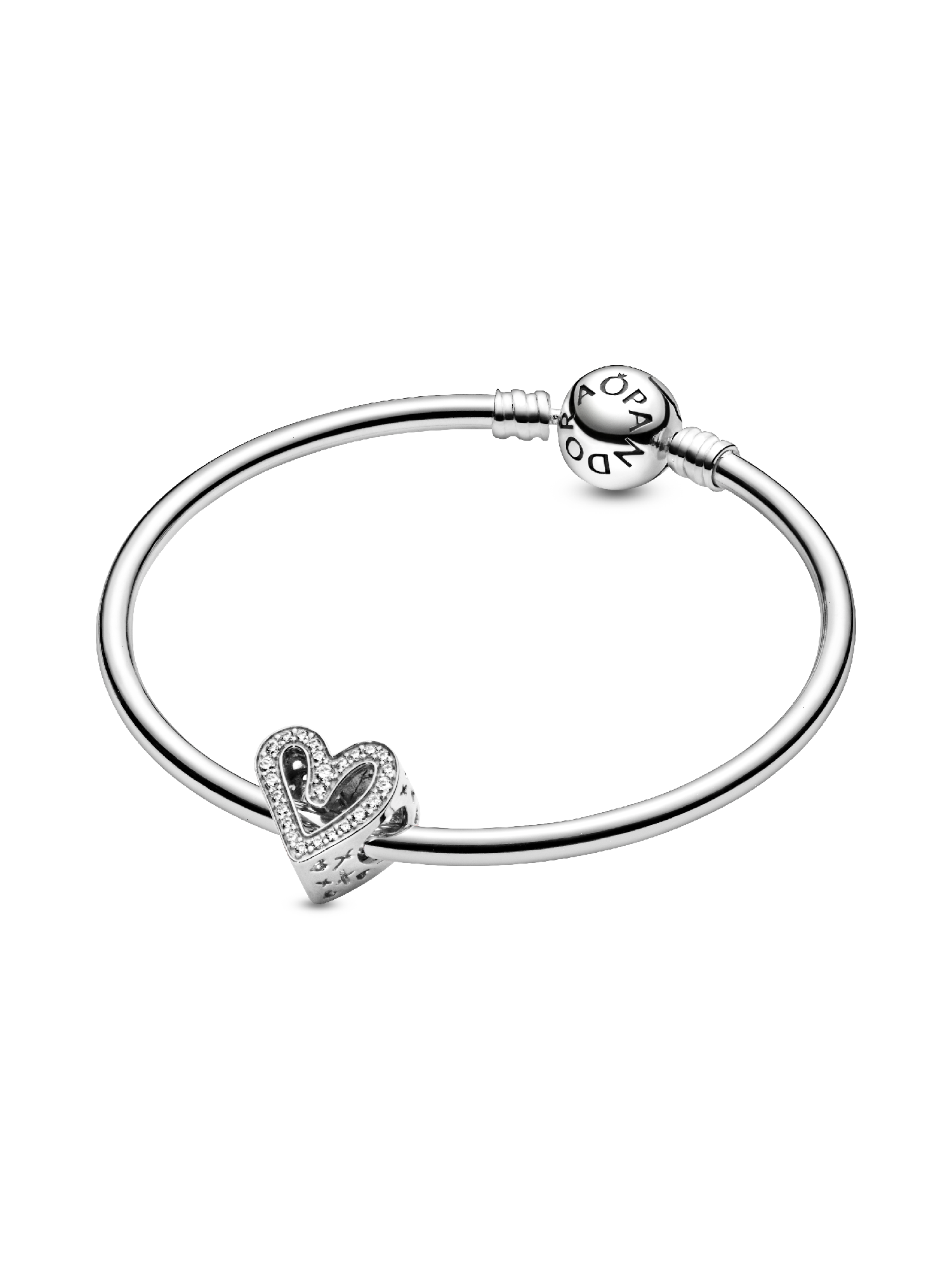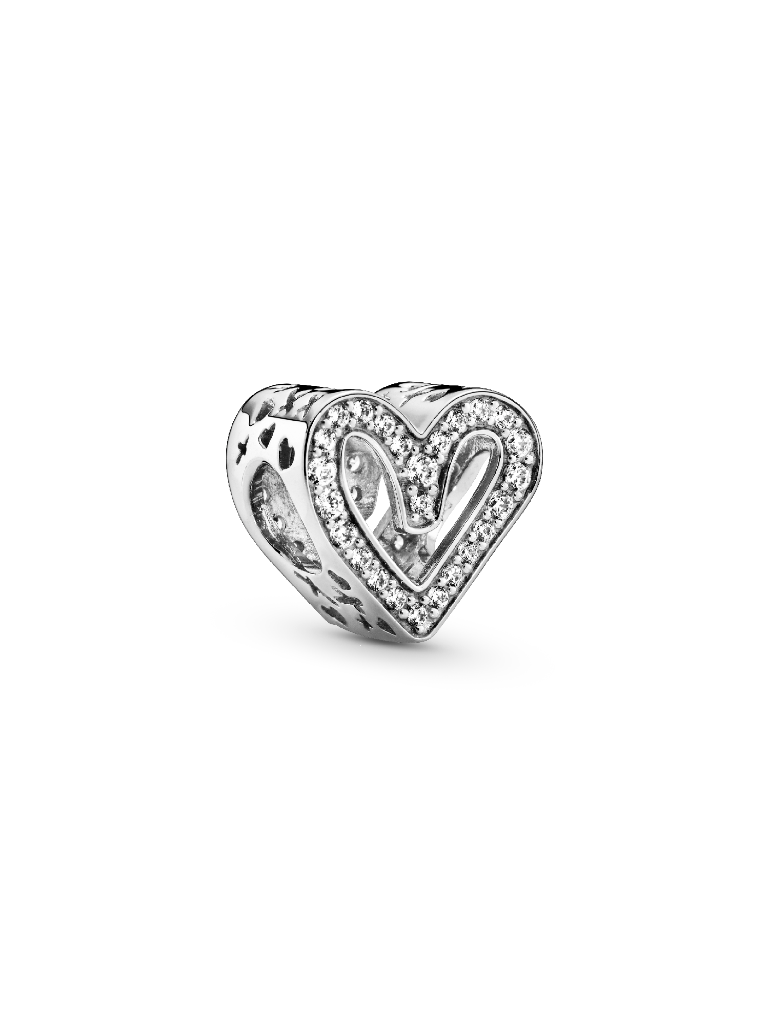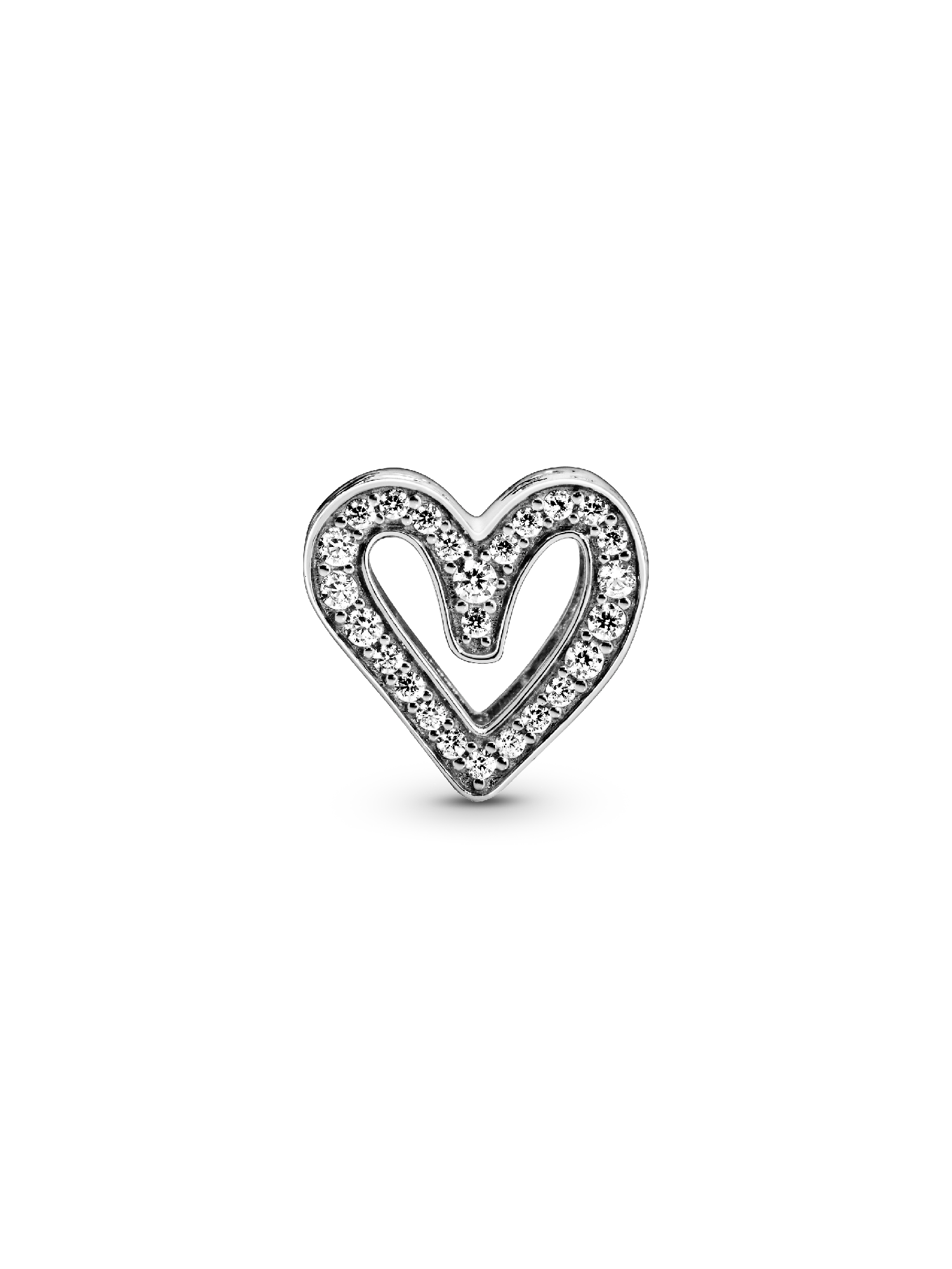 Carry your love with you as you go with this sterling silver Sparkling Freehand Heart Charm, designed to represent perfectly imperfect love. Who does the freehand heart bring to mind for you? 50 brilliant-cut clear cubic zirconia make love sparkle and cut-outs around the edges resemble “xoxo”. This charm is the perfect way to show the world what a gift the love in your life is. Style it with your other favorite Pandora charms.