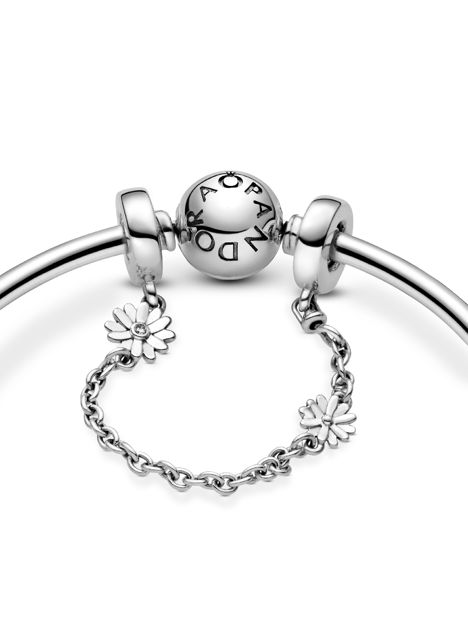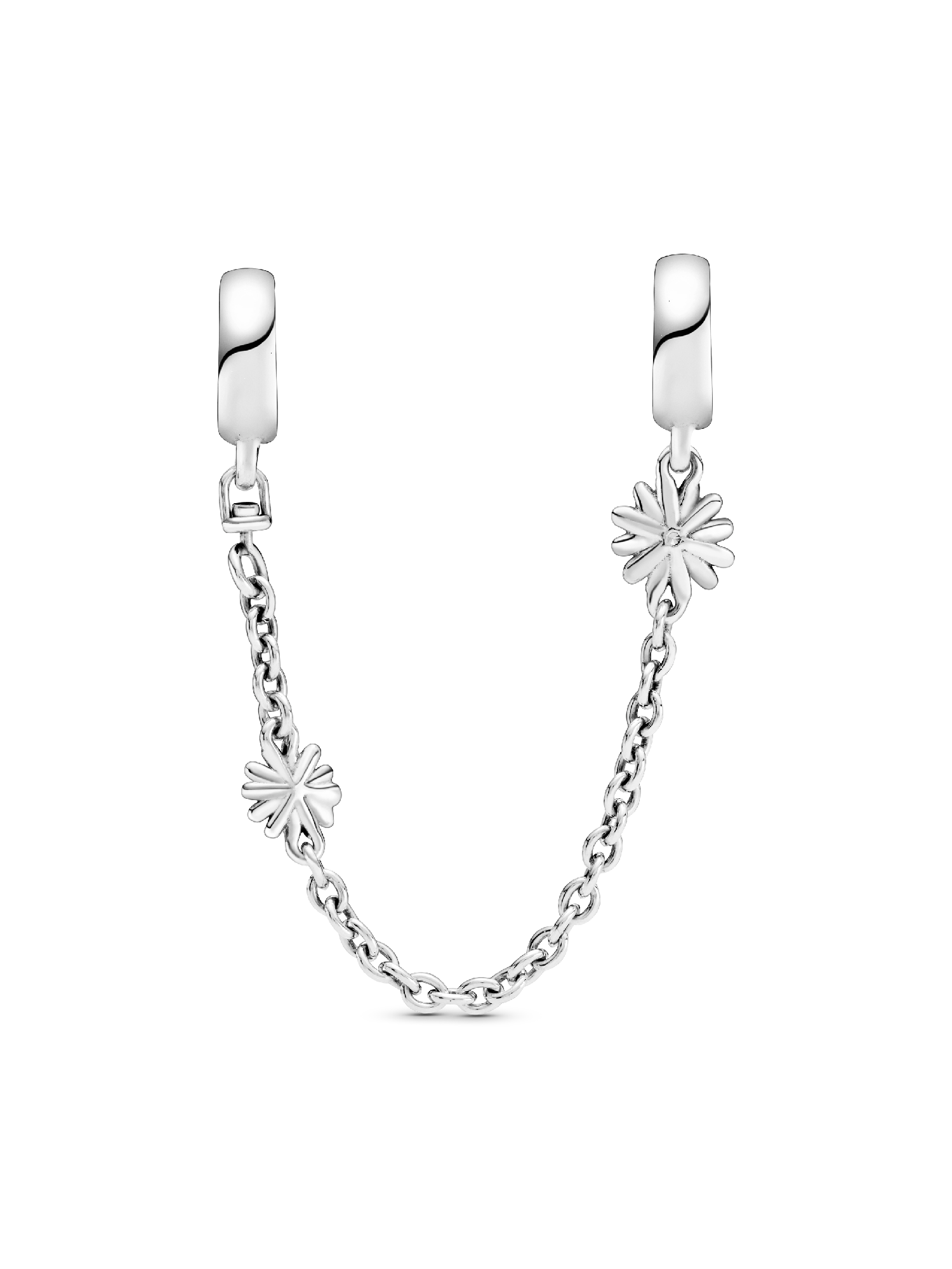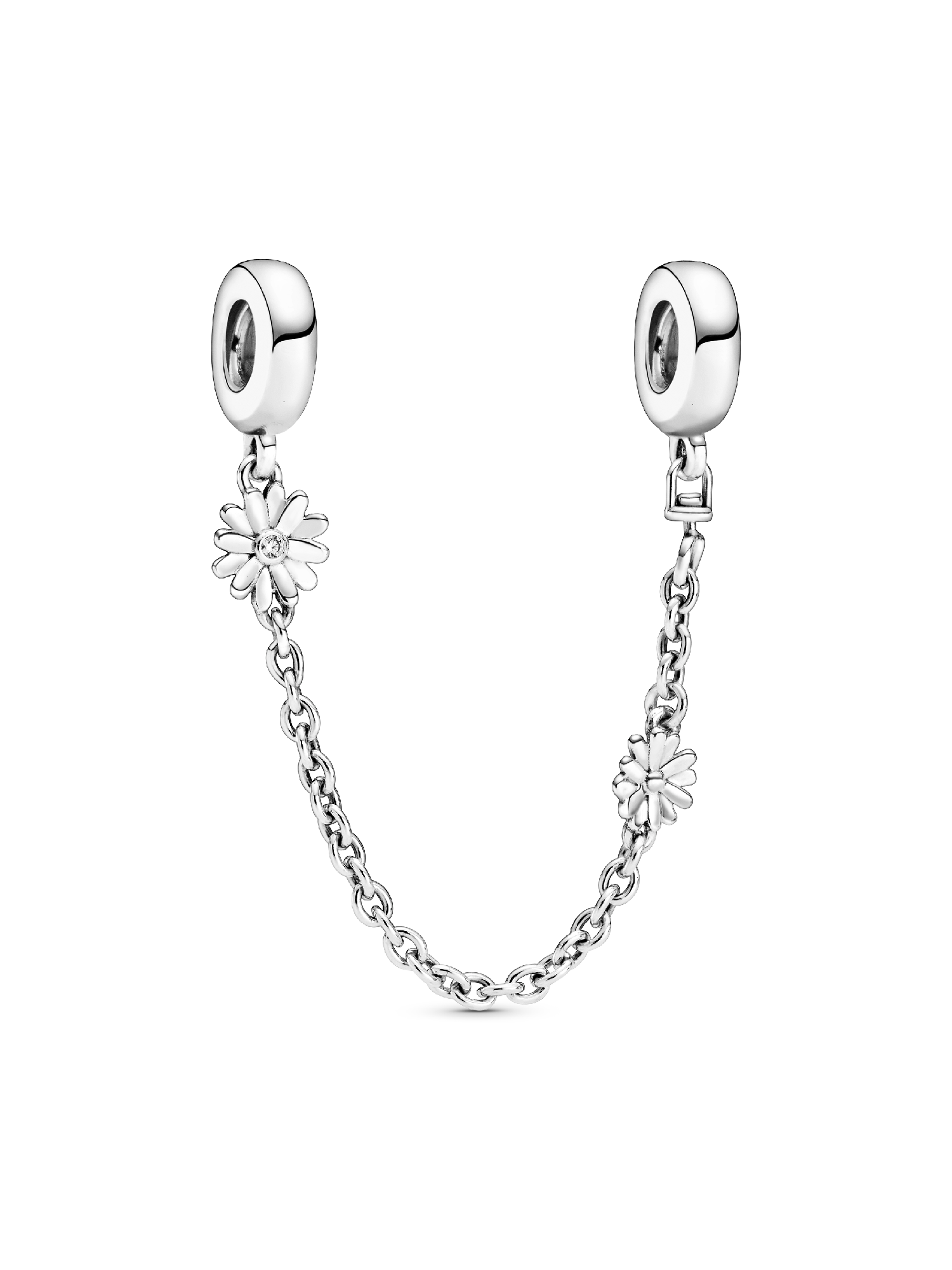 Keep your spring charm collection in place with the Pandora Moments Daisy Flower Safety Chain Charm. With two different-sized daisy flower details, the sterling silver safety chain makes sure that your charms stay safely on your Pandora Moments bracelet, while looking fresh and stylish. Featuring a single cubic zirconia for added sparkle, the daisy safety charm is inspired by the bold and freedom-loving symbolism of the delicate flower. Pair with other floral charms for the ultimate spring-inspired look.