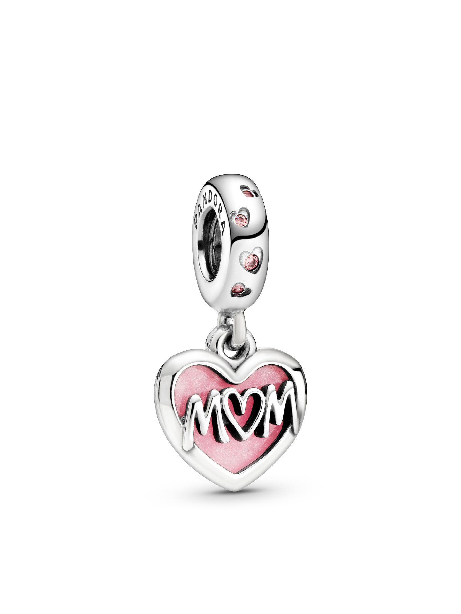 Make your mom feel special with this sterling silver double dangle charm. The charm is colored with pink hand-applied enamel on the back dangle, while the front disk features a “MUM” openwork script with a heart-shaped detail. The bail is dotted with fairy tale pink cubic zirconia for a touch of sparkle. The engraving on the back dangle reads “I love you”, making it the ideal present for the mother figure in your life.