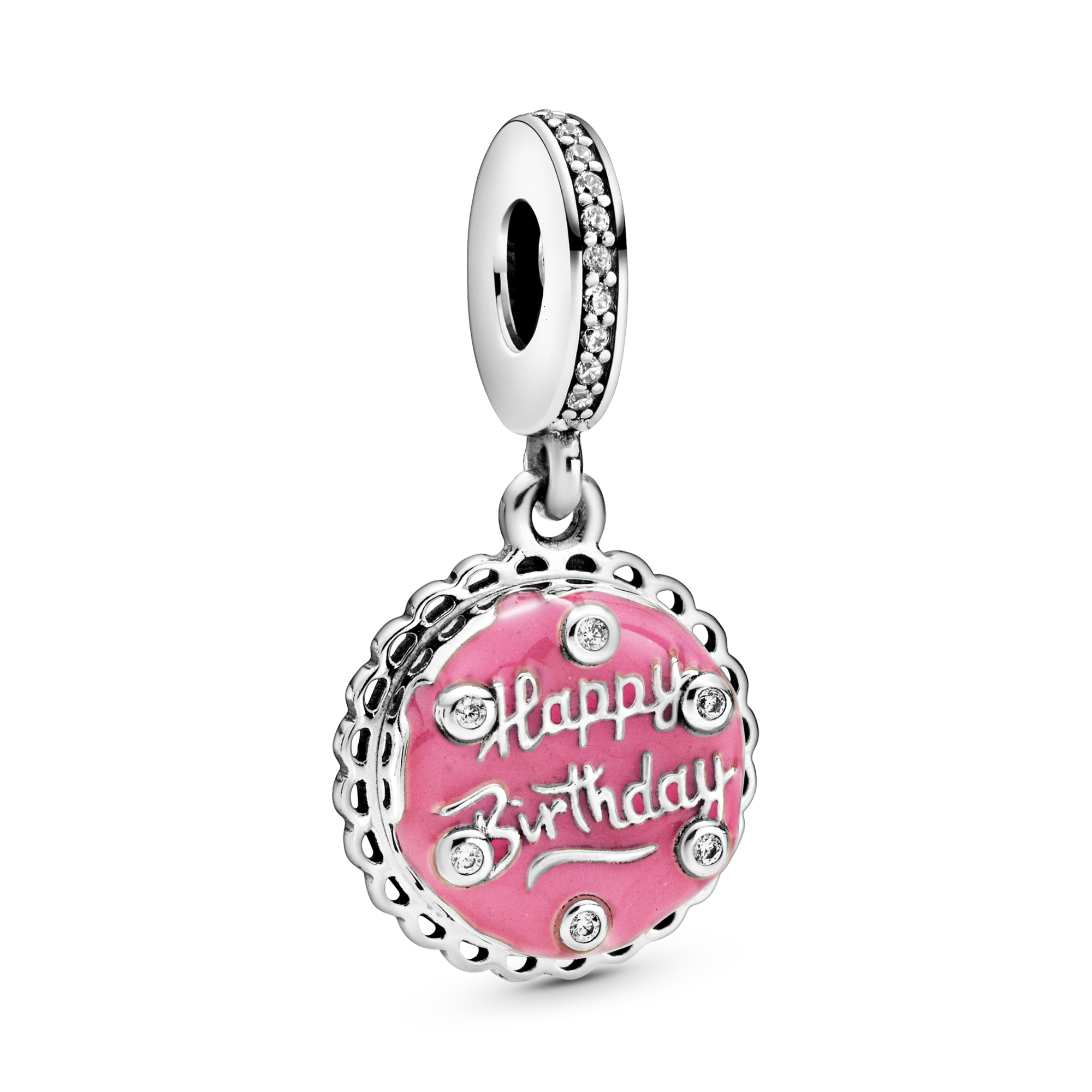 Say “Happy Birthday” with this sterling silver Pink Birthday Cake Dangle Charm. Celebrate the special day with a cake charm that will keep you in festive spirits all year round. The dangle features a hand-applied pink enamel design and clear cubic zirconia dotted around representing candles. The raised “Happy Birthday” script on the front dangle is joined by a candle symbol engraving and the message "Make a wish!" on the back. Make any birthday one to remember with this celebratory charm.