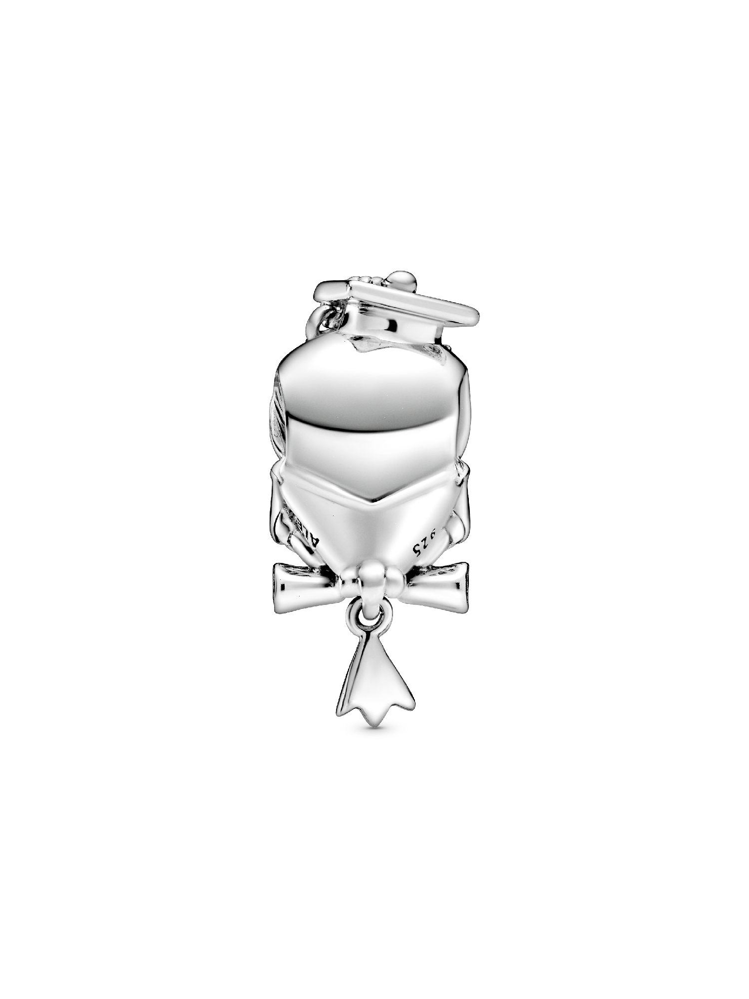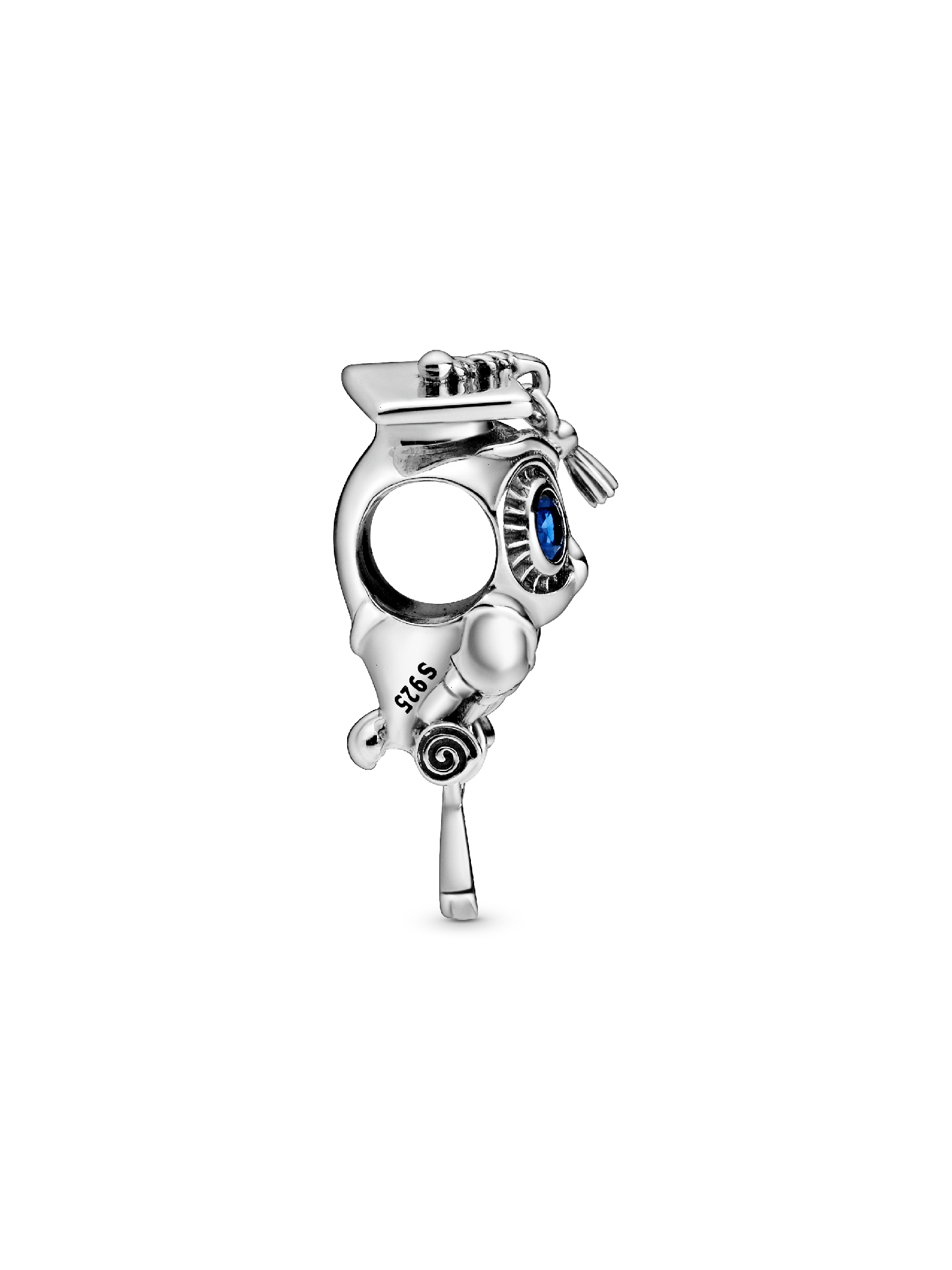 Celebrate scholarly achievement with the sterling silver Wise Owl Graduation Charm. Commemorate the special milestone that serves as a reminder of all of your hard work and personal growth with a charm featuring an owl wearing a graduation hat sitting atop a scroll, both of which feature a dangling tassel. The owl’s eyes are two stellar blue crystals. Wear the graduation charm as a symbol of the fact that you can accomplish anything you put your mind to.