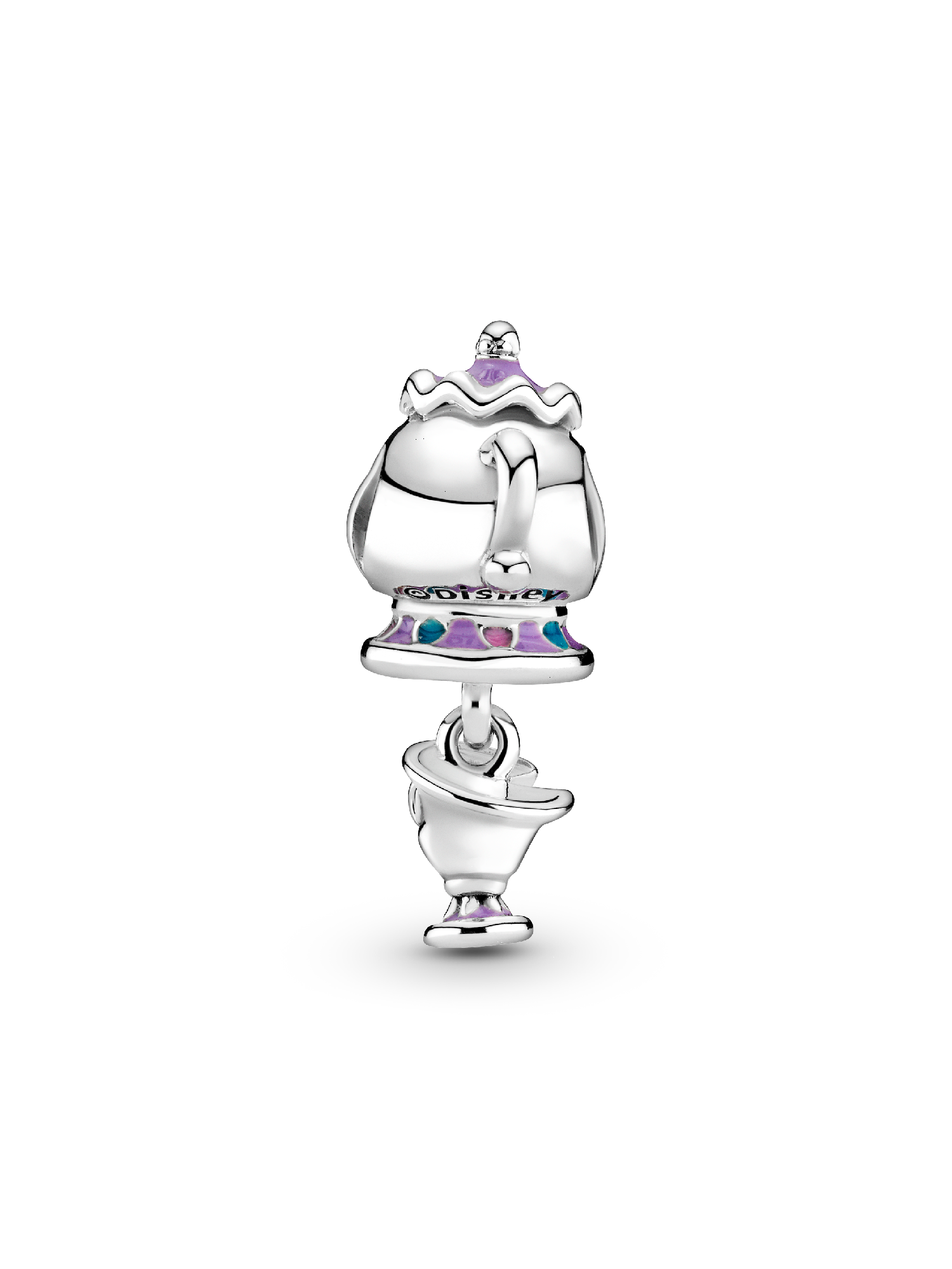 Be our guest and help yourself to this Disney Beauty and the Beast Mrs. Potts and Chip Dangle Charm. Featuring two of the most unforgettable characters from Disney's Beauty and the Beast, this sterling silver Mrs. Potts-shaped charm features an adorable little Chip swinging from the base. Both characters are brought to life with lilac, blue and pink hand-applied enamel details. The sweet charm will add heartwarming cheer to every look.