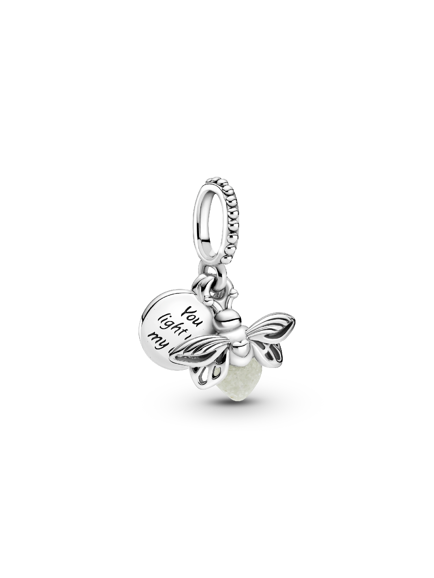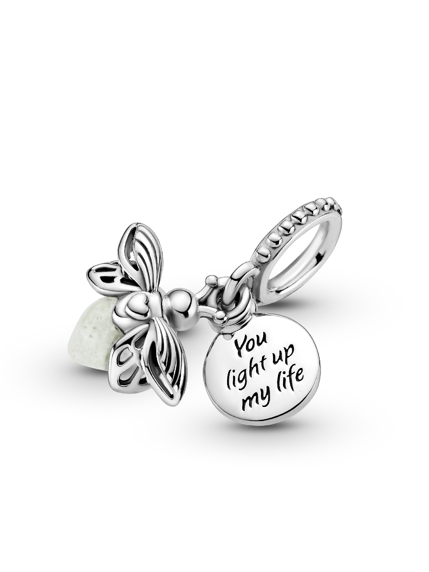Light up your look with the Glow-in-the-dark Firefly Dangle Charm. Hand-finished in sterling silver, this firefly charm features rounded glow-in-the-dark glass – white in the daylight and milky green at night – which recharges when exposed to sunlight or UV light. A second silver disc reads 'You light up my life.' This engraved charm makes the perfect gift for the one you love, or a stylish statement of self-love to remind you of the light you carry within.