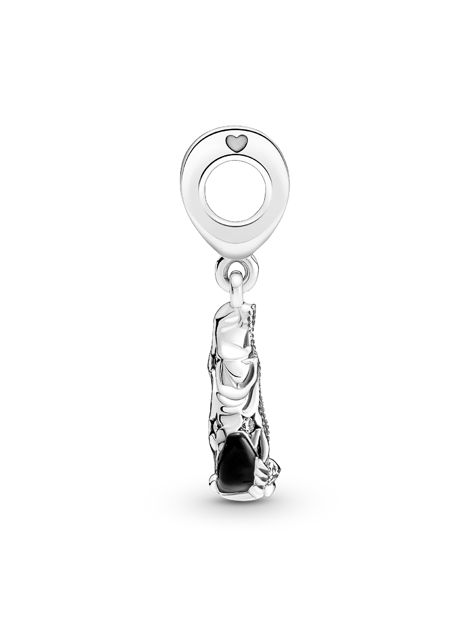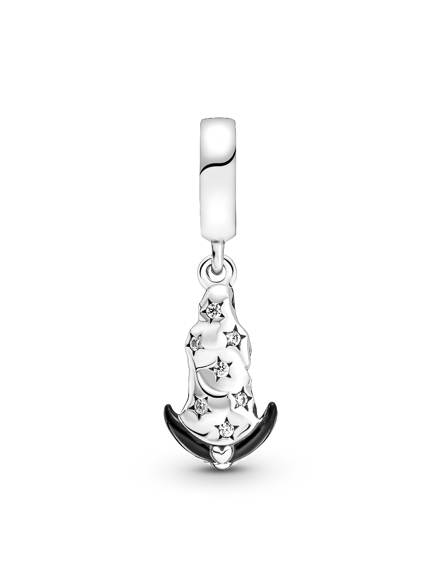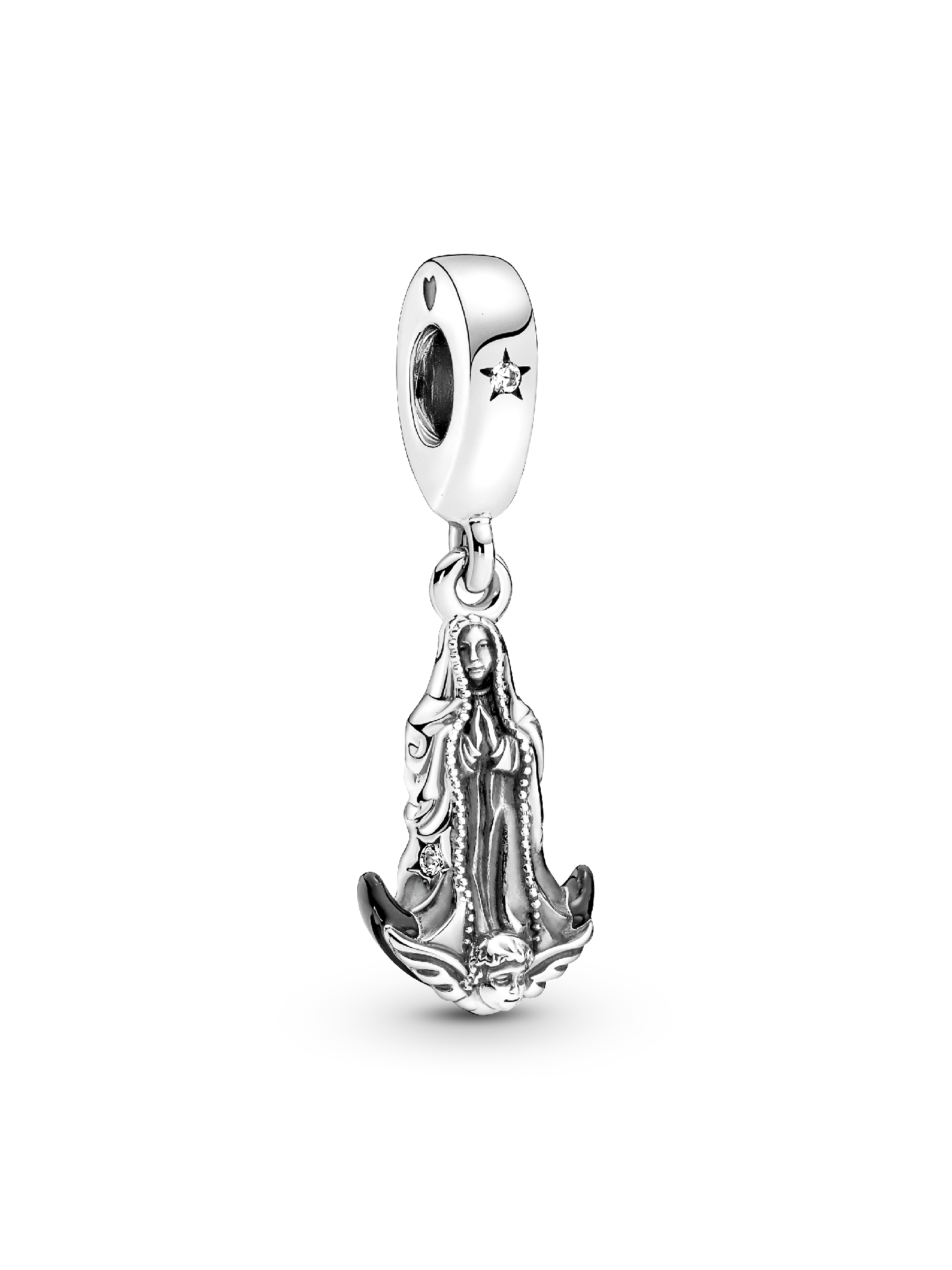 Keep your faith close with the Virgin of Guadalupe Motif Dangle Charm. This sterling silver charm features the Virgin, her hands clasped, standing serenely on a crescent moon carried by an angel. Black hand-applied enamel adds a striking touch, while the cloak is decorated with sparkling stones set in stars and small micro beads on the edge. The bail features one stone set in a star on the front, as well as engraved hearts on the sides.
