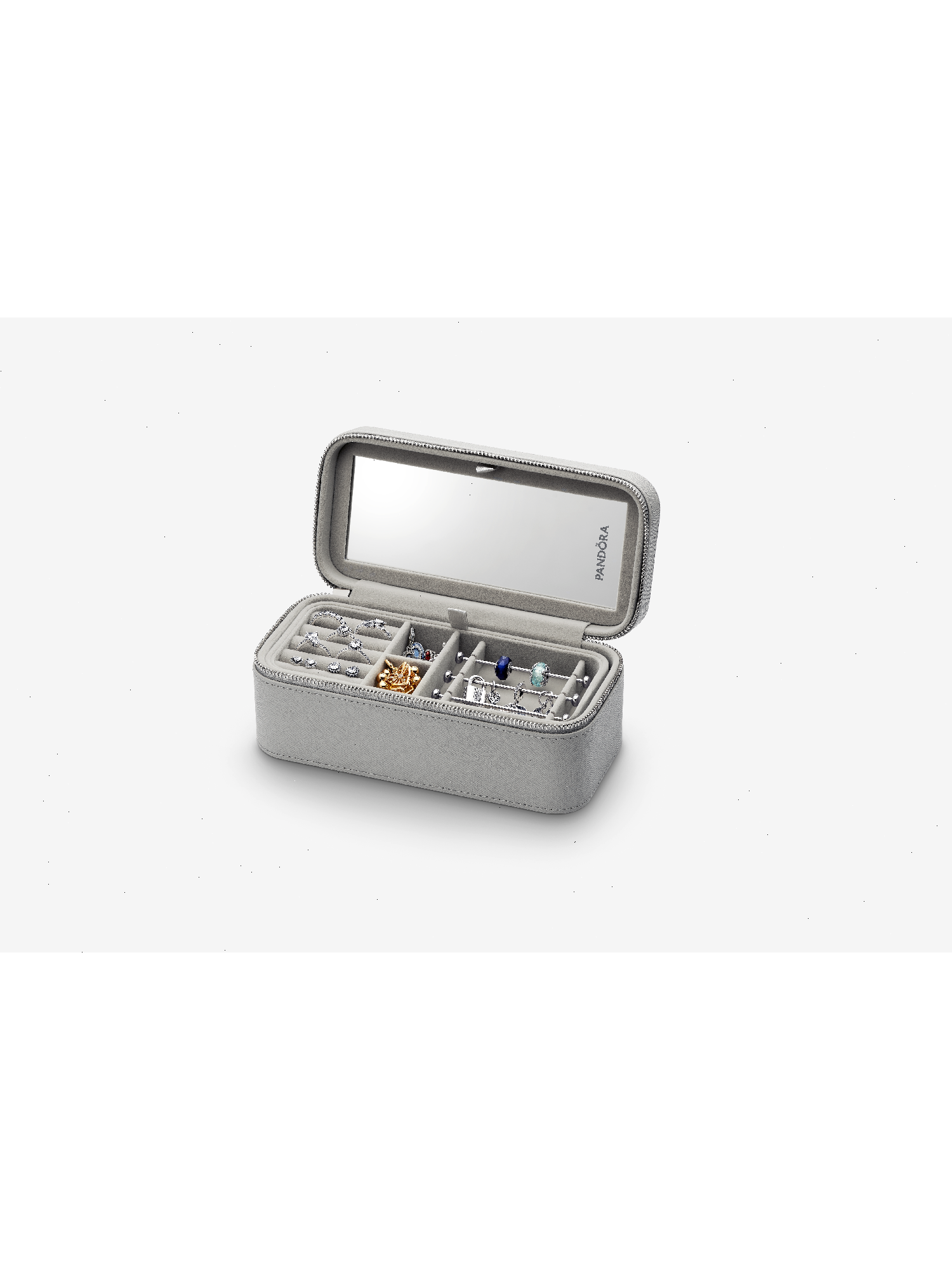 Introducing the perfect place to store your Pandora jewelry, crafted to organize and protect your favorite pieces and keep them safe. Our thoughtfully designed jewelry box has a textured PU exterior and separate velvet-lined compartments inside for storing different items of jewelry. The box features a removable top tray for your charms, rings and earrings, a flat insert for necklaces and a compartment underneath for bracelets. Two D-rings on the zip allow you to lock the box and a mirror inside the lid is handy for putting together your look each day. The perfect home for your treasured pieces or a thoughtful accompaniment to a sparkling gift. Jewelry not included.