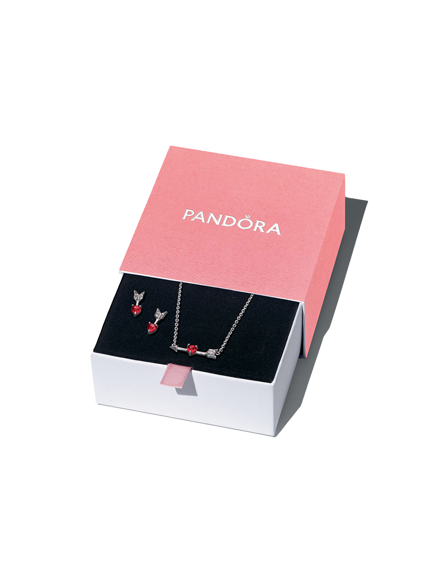Give the gift of love at first sight. This pre-styled set includes a necklace and pair of stud earrings with arrow motifs, inspired by Cupid himself. Each piece features glittering pavé and a red Murano glass heart, evoking the passion and irresistibility of love’s desires. Be a romantic. Be love.