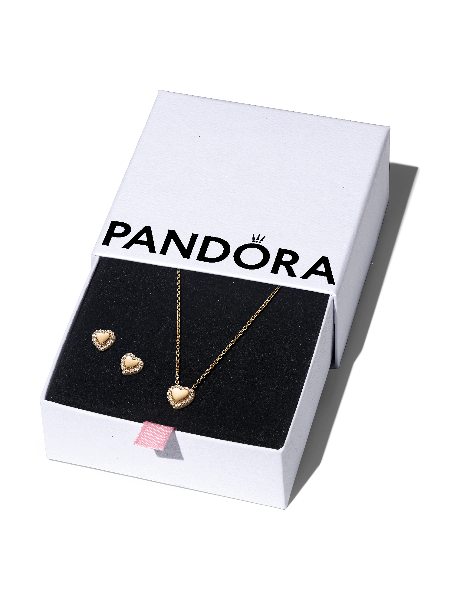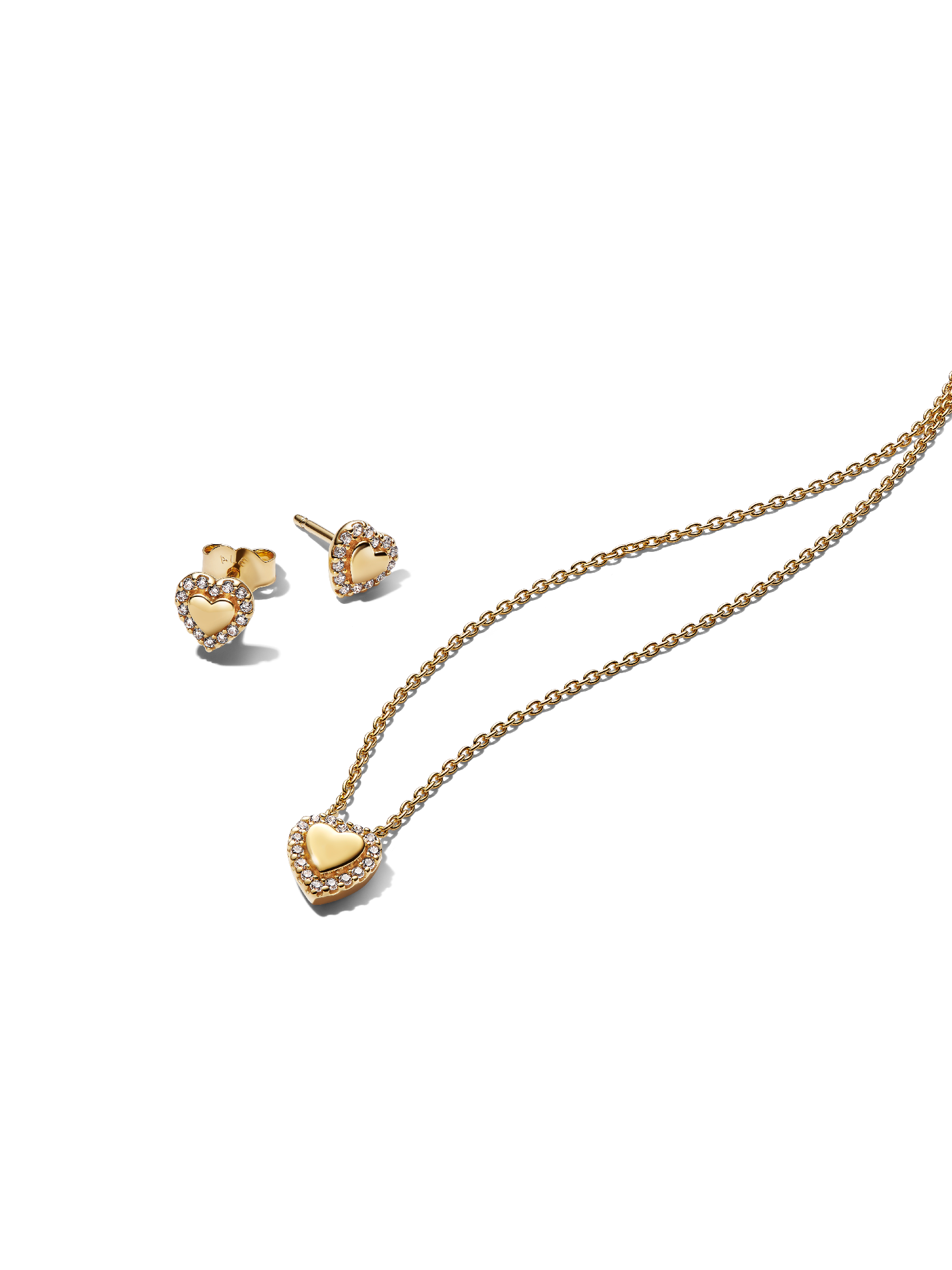Mark your moment. This 14k gold-plated gift set features a halo heart necklace with space to engrave a name or date, paired with sparkling stud earrings, all set with clear cubic zirconia.