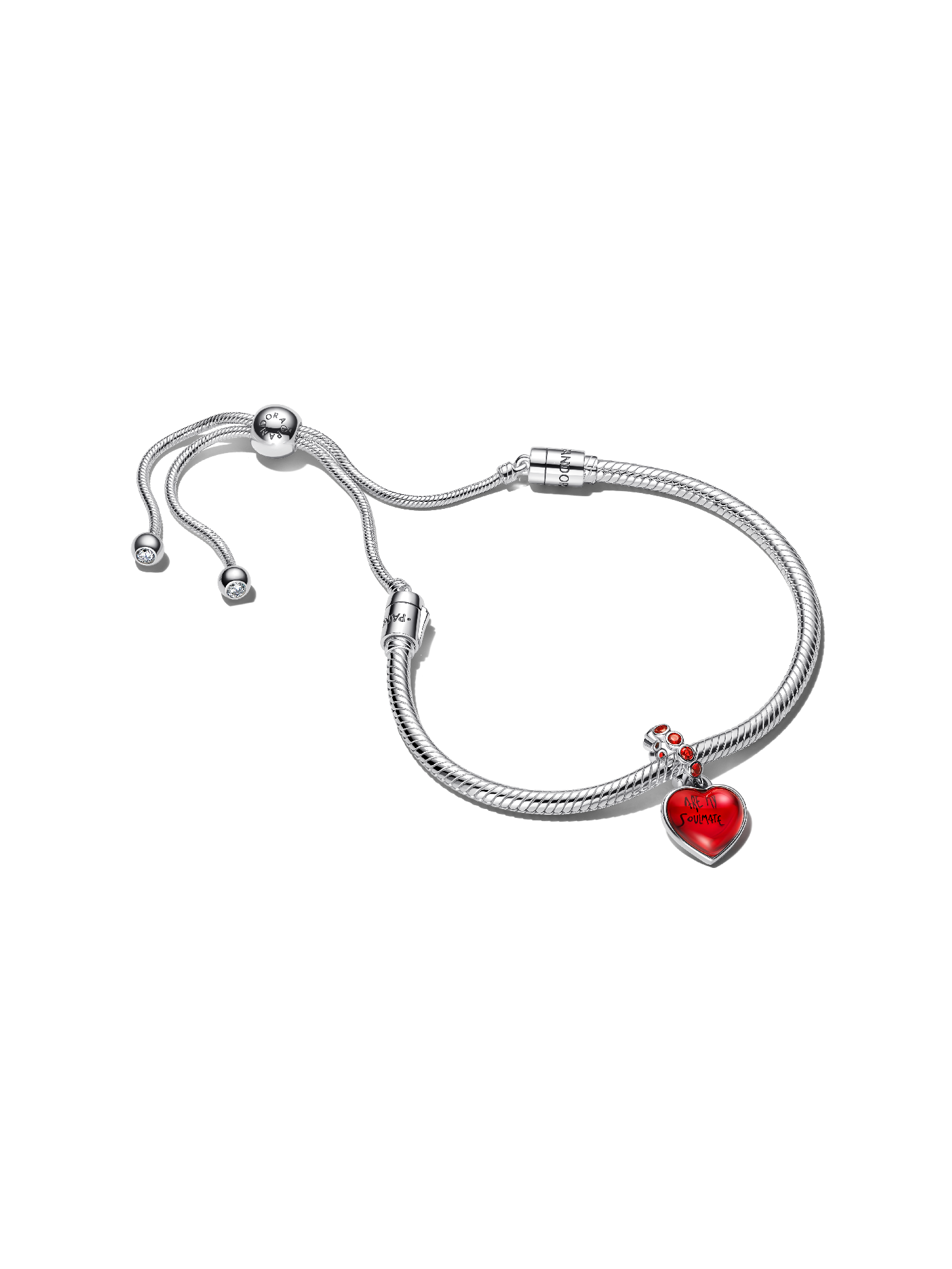 Say it with sparkle. A red Murano glass charm engraved YOU ARE MY SOULMATE pairs with a sterling silver slider bracelet for a gift full of love.