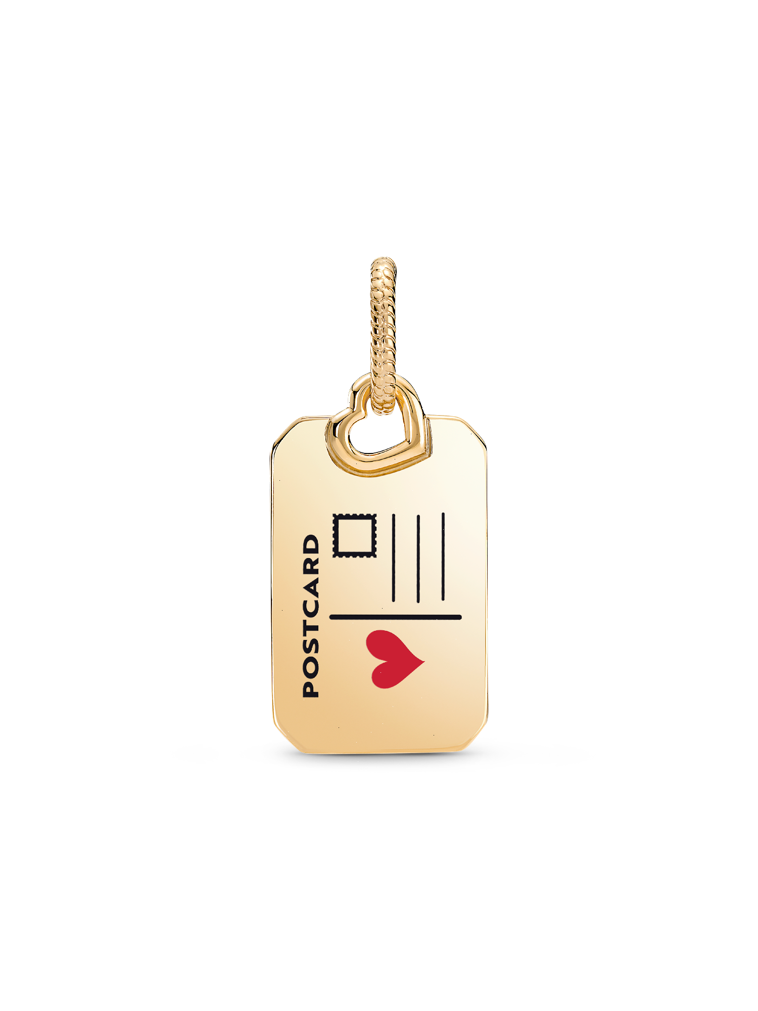Celebrate your wanderlust! This 14k gold-plated pendant is engraved with “Greetings from the USA” in red, white, and blue to capture your travel story. The back is engraved with a classic postcard design.