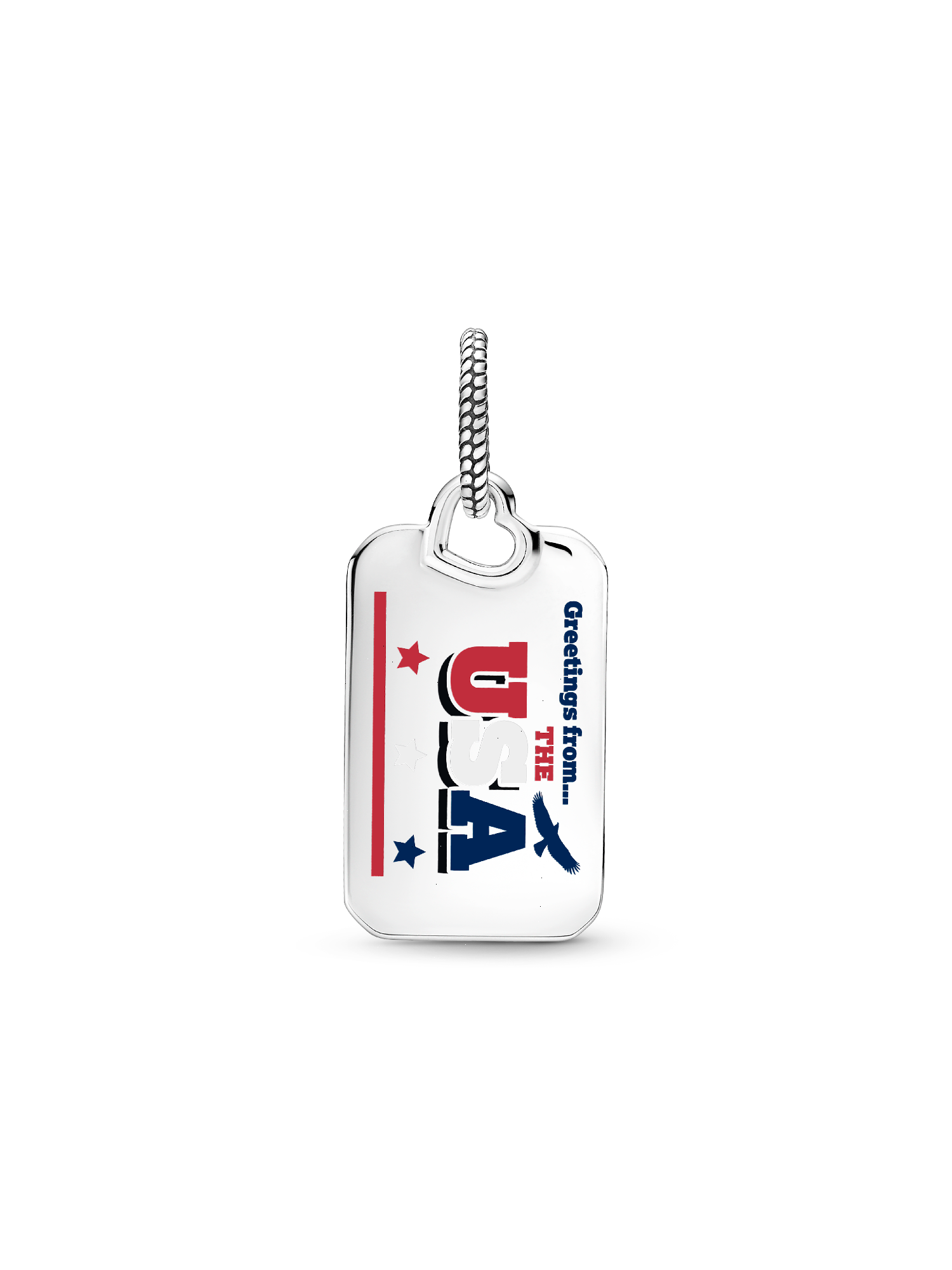 Celebrate your wanderlust! This sterling silver pendant is engraved with “Greetings from the USA” in red, white, and blue to capture your travel story. The back is engraved with a classic postcard design.