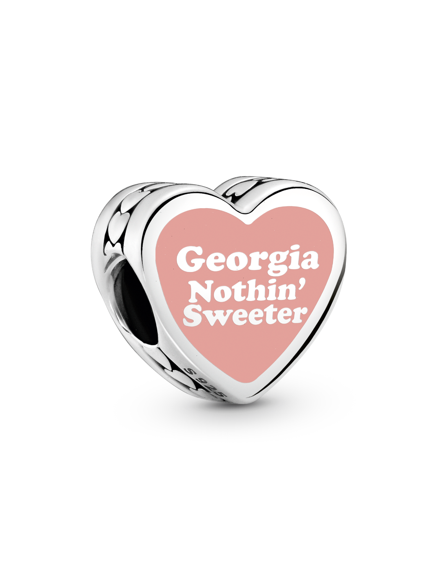 Show your love for the Peach State with the Georgia Nothin' Sweeter Charm. This heart-shaped charm is beautifully detailed with a row of hearts around the edge, adding a soft, romantic touch. One side features a Georgia peach hanging from a branch, with the stunning Georgia night skyline in the background, evoking southern charm. On the other side, a peach-pink heart with "Georgia Nothin' Sweeter" engraved inside captures the warmth and sweetness of the state. This charm is a sweet reminder of Georgia’s unique beauty.