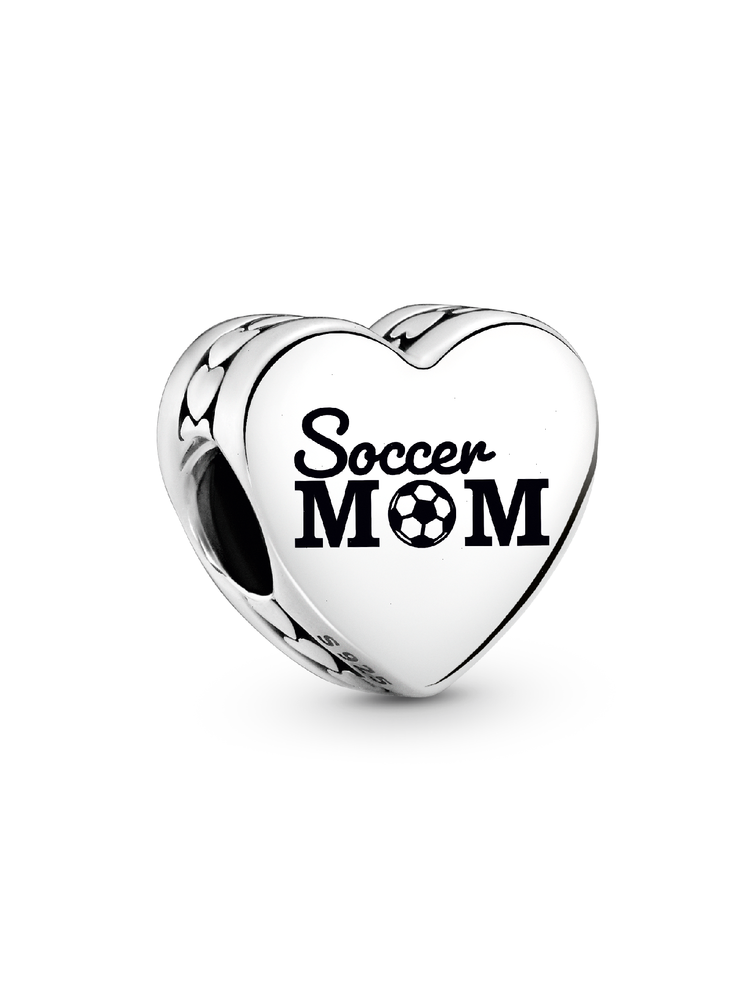 Celebrate your love for the game with this sterling silver Engravable Soccer Mom Heart Charm, featuring a row of polished hearts around the edges. Engraved with "Soccer Mom," with a soccer ball as the "O," this charm is a perfect way to honor your role on the sidelines. The back is engravable, offering space for a personal message, making it a unique and meaningful keepsake.
