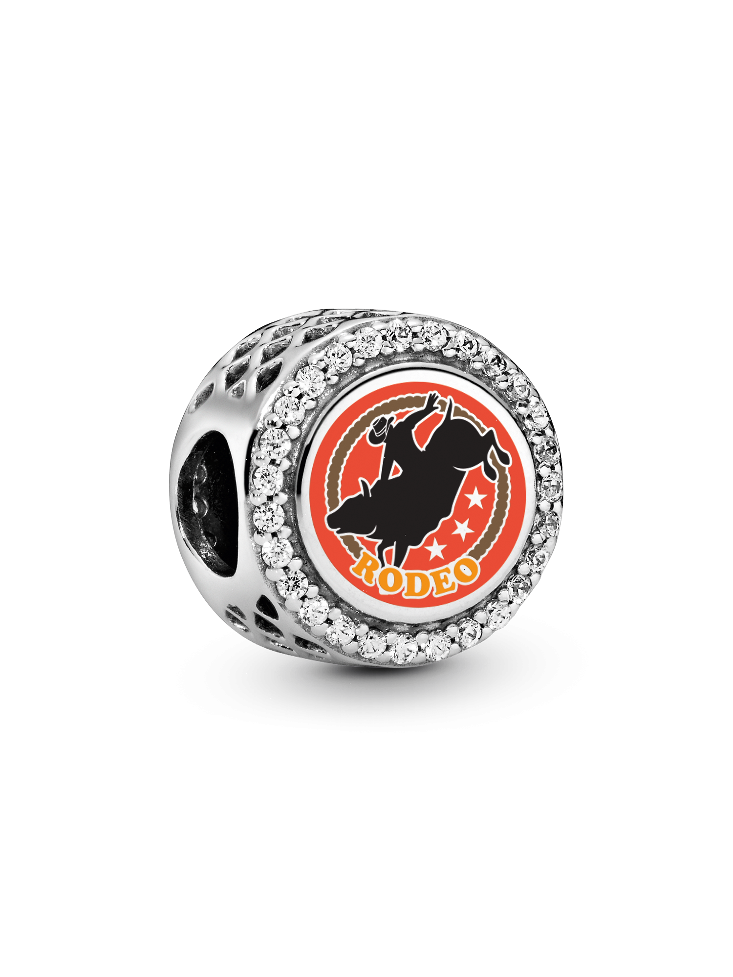 Embrace the energy of the rodeo with the Rodeo Bucking Bull Charm. Hand-finished in sterling silver, this bold design features a dynamic rodeo scene with a rider atop a bucking bull, complete with Rodeo engraved beneath it. Sparkling clear cubic zirconia borders both sides that mirrors the excitement of the rodeo. The reverse side offers space for a custom engraving, allowing you to add a personal touch. A border of hearts along the edge highlights the charm’s rugged yet heartfelt appeal. This piece is a tribute to the thrill and tradition of the rodeo.